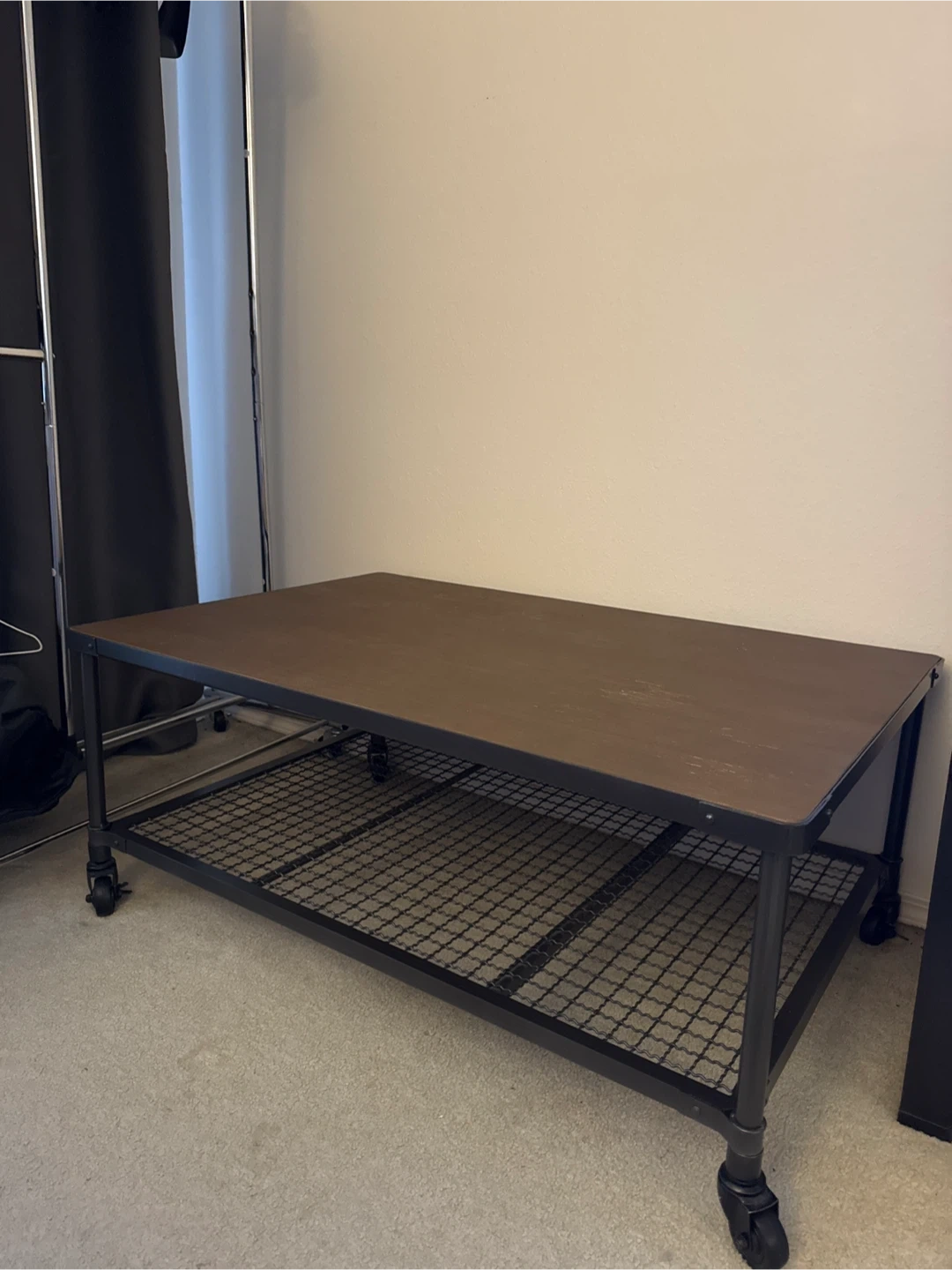Selling a rolling coffee table with a dark brown wood top and a black metal frame. It has a wire mesh shelf underneath for extra storage. There are some visible scratches on the top surface.