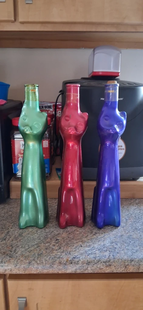 Selling three decorative bottles shaped like cats! They come in green, red, and blue. They would look great on a shelf or as part of a collection