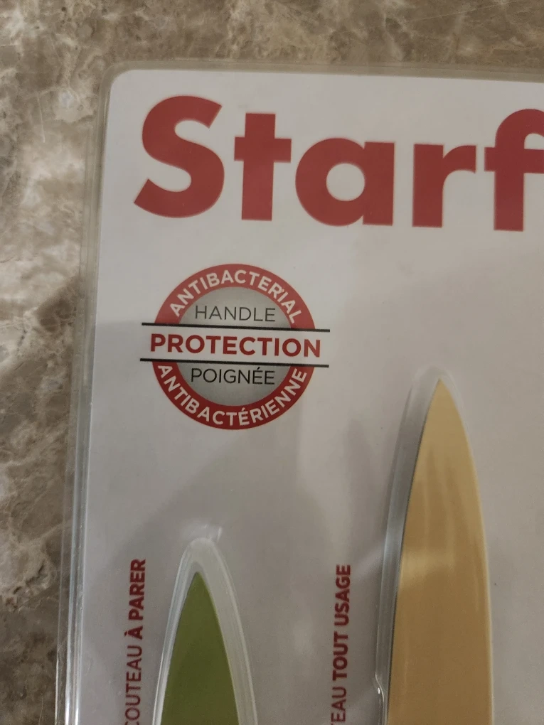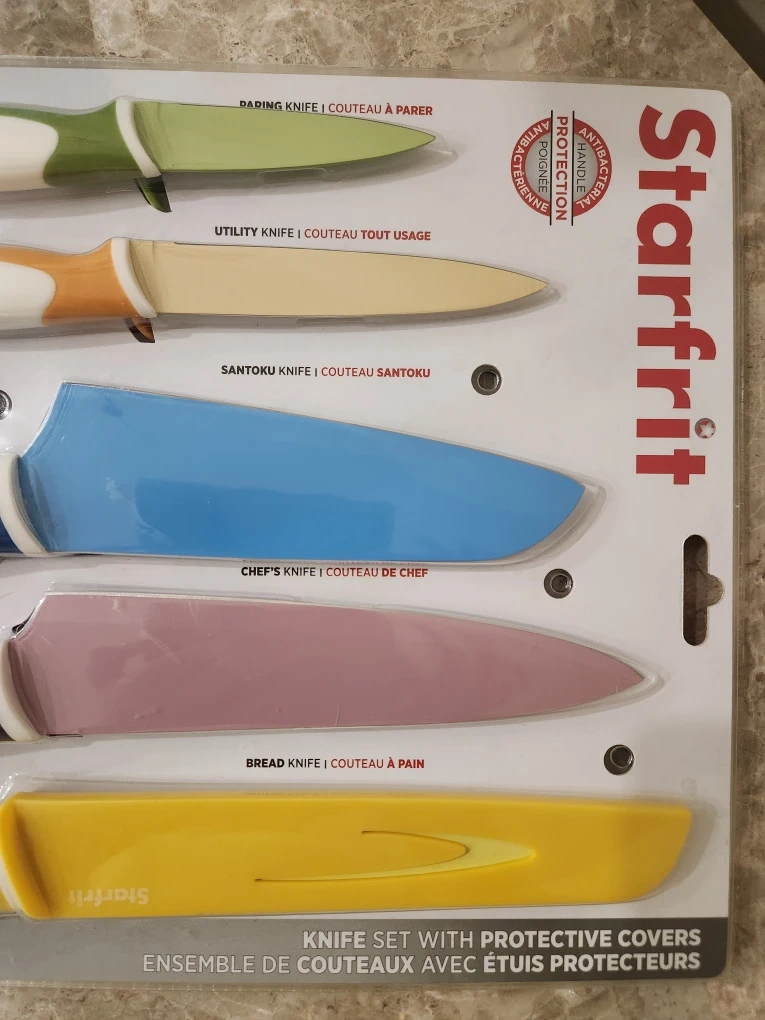 Selling a brand new Starfrit knife set with protective covers. This set includes a variety of knives, perfect for all your cooking needs. Each knife has an antibacterial handle for added protection. The set includes protective covers for safe storage. It's a 10-piece set, ready to help you in the kitchen!
