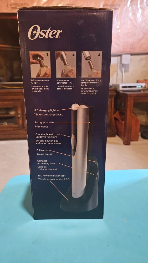 Selling an Oster electric wine opener with chiller! It easily opens up to 30 bottles fully charged with the touch of a button. It's cordless operation with recharging base for convenience and mobility. Stylish and ergonomically designed with a soft grip handle to fit the palm of your hand for a firm grip. Includes a wine chiller and the original box