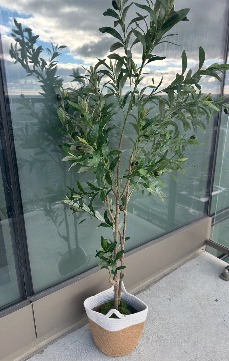 Add a touch of greenery to your space with this Warmplants 5ft (60") Artificial Olive Tree! It's a tall fake olive plant with faux silk leaves, perfect for adding a modern touch to your living room, home office, or corner decor. It comes with a woven basket and is easy to assemble. Originally bought for $84.23