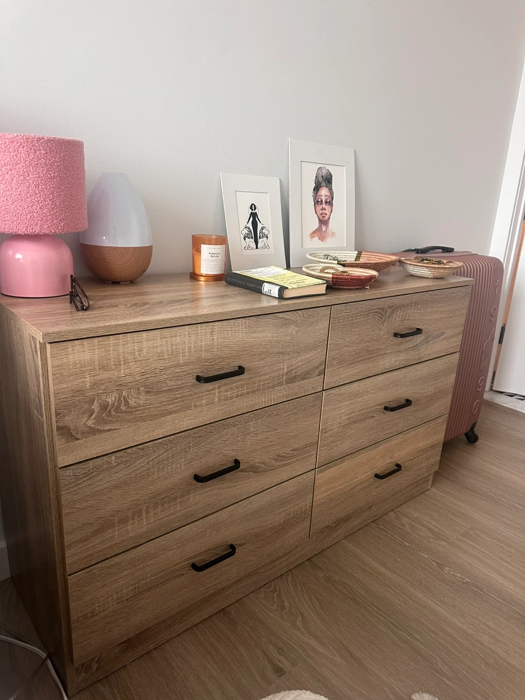 Here's a spacious 6-drawer dresser with a lovely wood grain finish! It offers plenty of storage for your clothes and accessories.