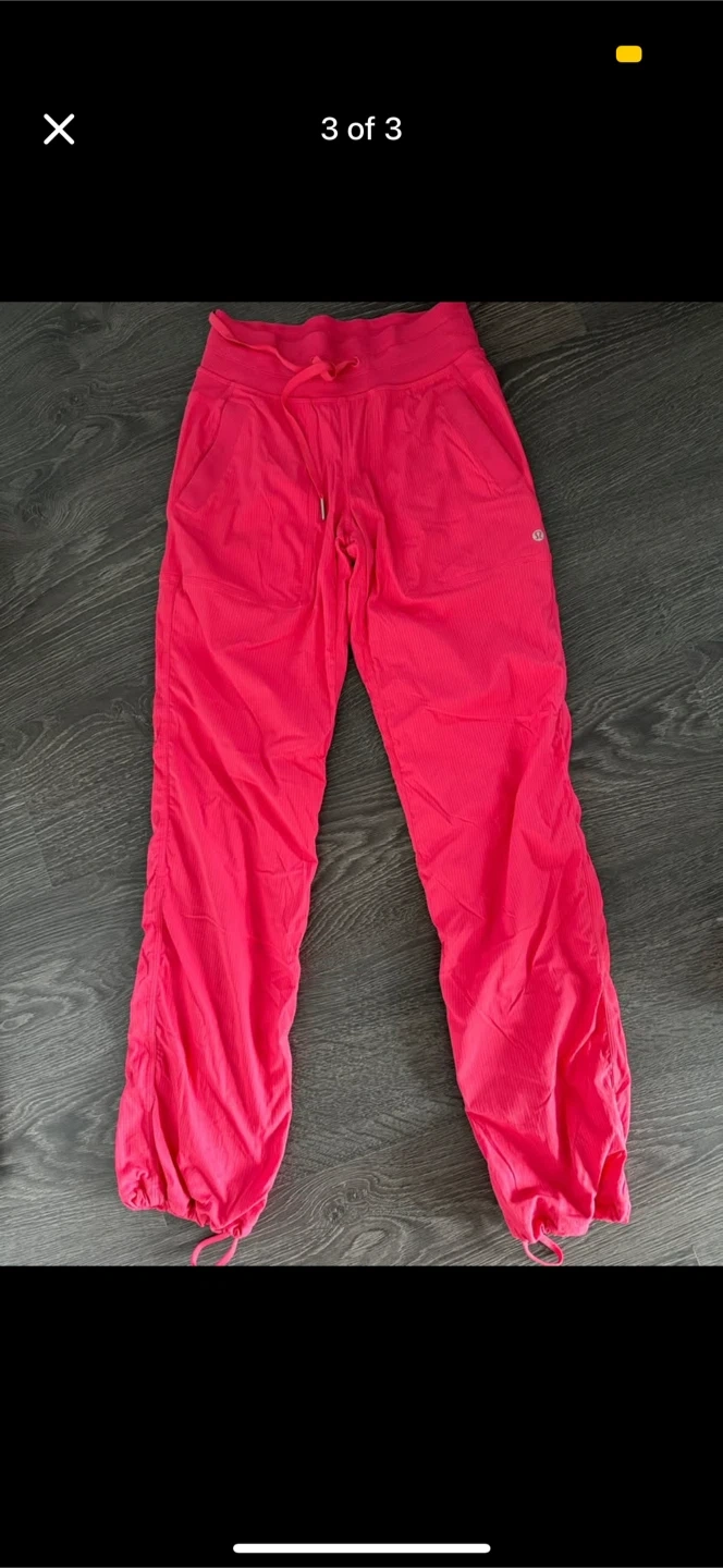 These Lululemon pants are a vibrant pink and feature a drawstring waist and adjustable cuffs at the bottom. They’re super comfy and stylish!
