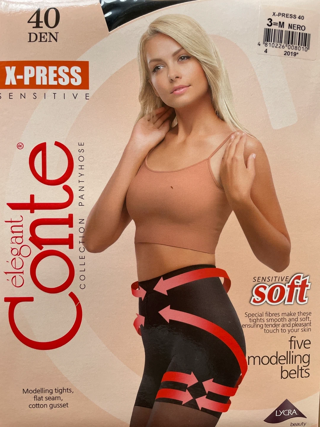 Conte Elegant X-Press 40 Den pantyhose in size 3-M (black). These tights are designed with special fibres to be smooth and soft, ensuring a tender and pleasant touch to your skin. They feature five modelling belts for a comfortable and supportive fit. The pantyhose also includes special high-pressure structure in the tummy area and a special band to lift the bottom