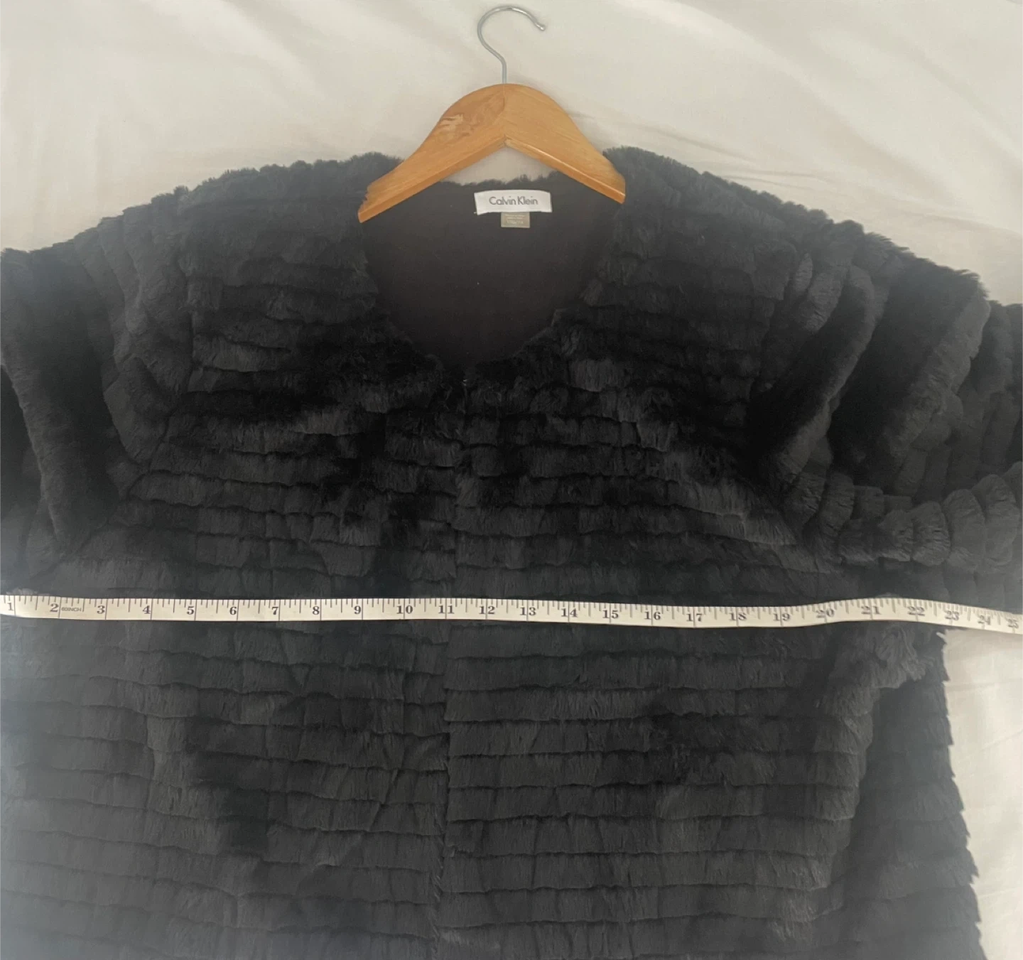 Selling a Calvin Klein black faux fur jacket in size 1TG/1X. The shell and lining are both 100% polyester. It's in great condition and ready for a new home! Worn ones