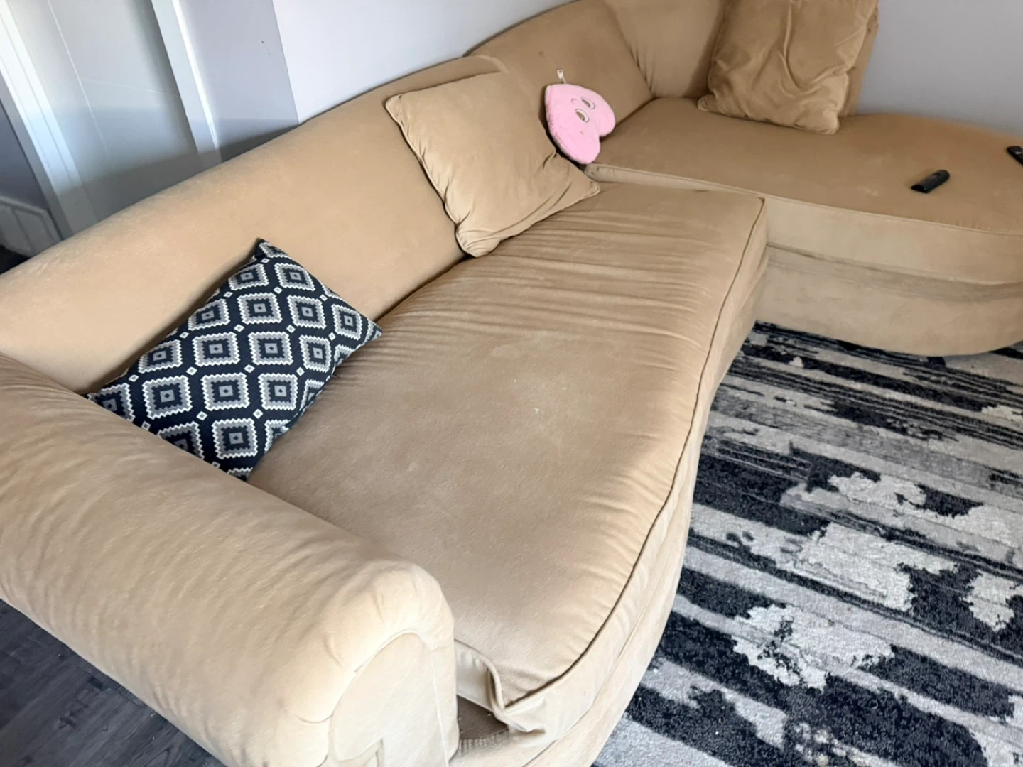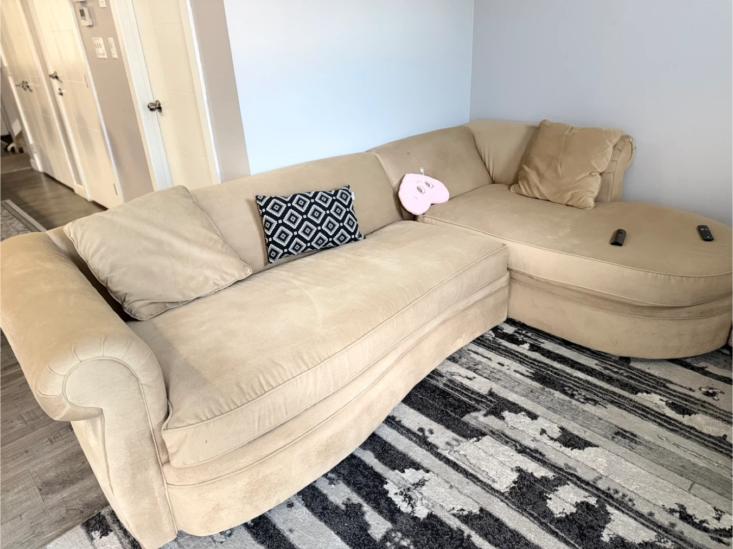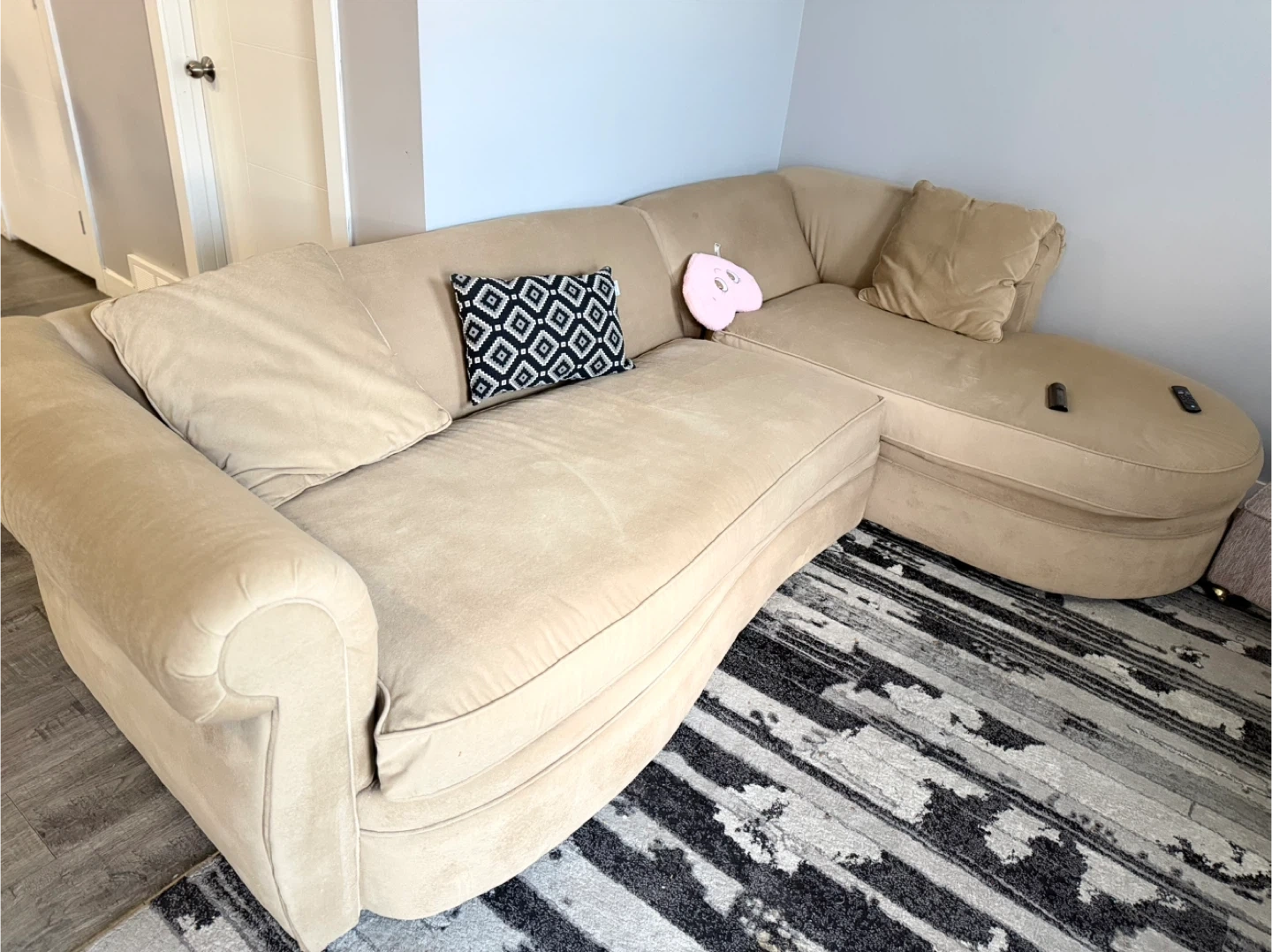 Selling a comfy beige sectional sofa. It comes with matching cushions and is perfect for a cozy living room setup. It has some signs of use, but it's still in good condition for relaxing and lounging around!