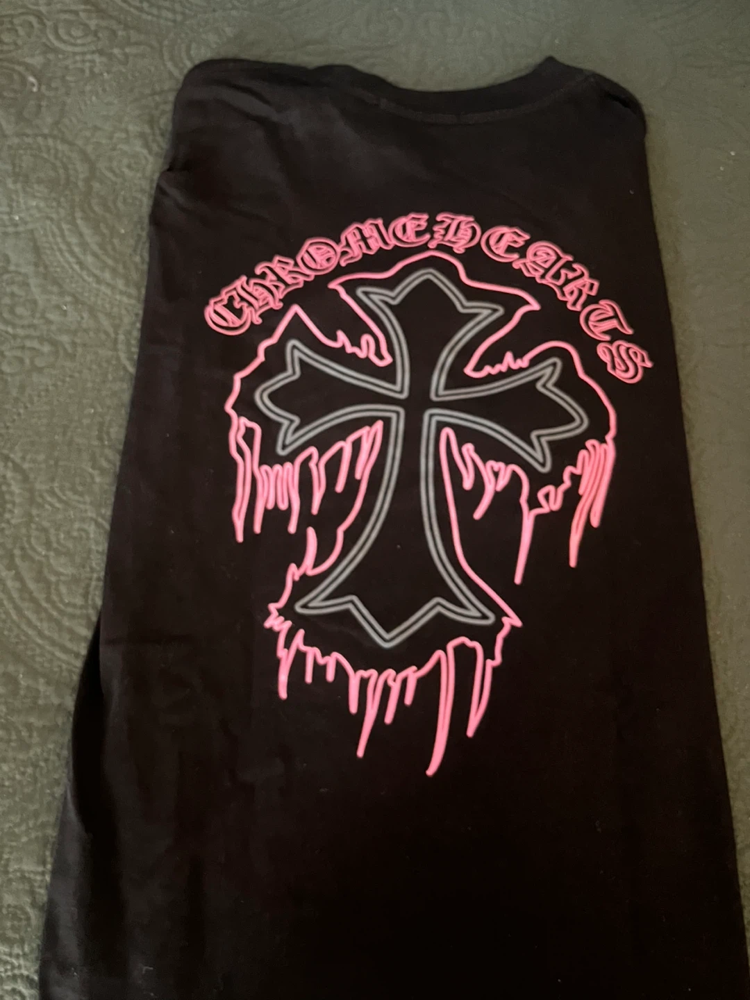 Selling a black Chrome Hearts t-shirt. It features the brand's iconic cross logo in a pink and white design on both the front and back. The shirt is in good condition and i’m selling this because it dosent fit me anymore