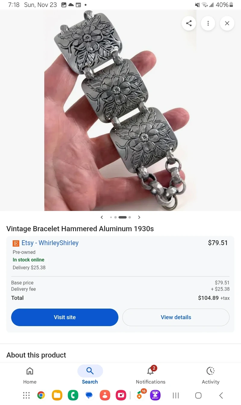 Buy & Sell1930s handmade aluminum Armour bracelet/have example photos1930s handmade aluminum Armour bracelet/have example photos$20Selling a Hand Made 1930s Era Hammered Aluminum Bracelet! It features a distinct geometric pattern on each of its three sections.great conditionConditionLike new0 chats·1 favorites·15 viewsSELLERsamanthaQueensway150 reviewsWHERE TO MEETDorchester Road & Morrison Street