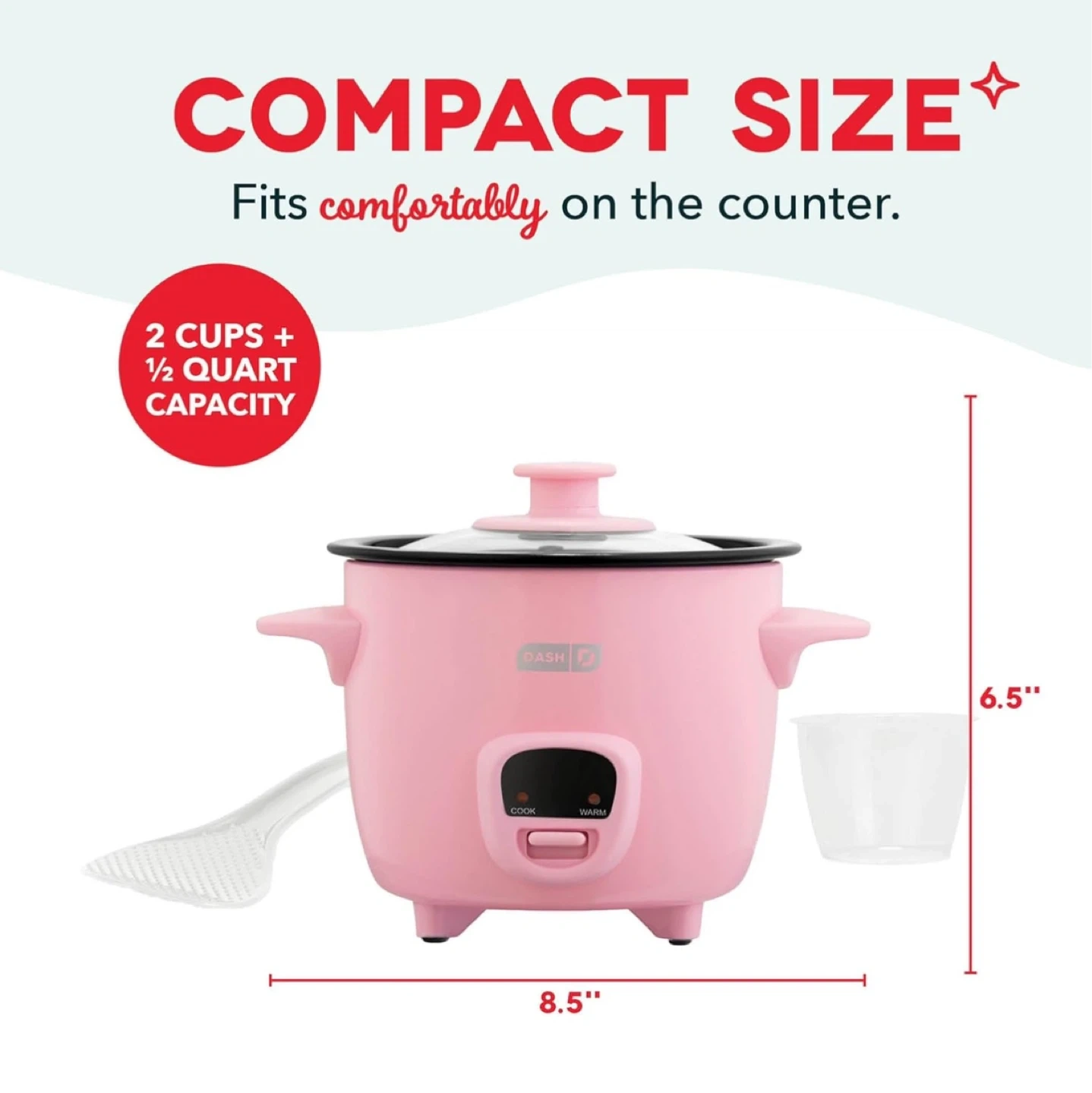 Includes: Dash Mini Rice Cooker, Rice Paddle, Measuring Cup, and Removable Pot.