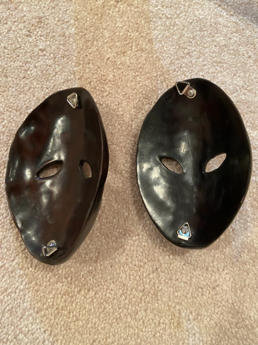 Selling two vintage wood masks. They are intricately carved and in good condition. Also included are 2 pottery-style masks which have faces on either end (can be hung either way).