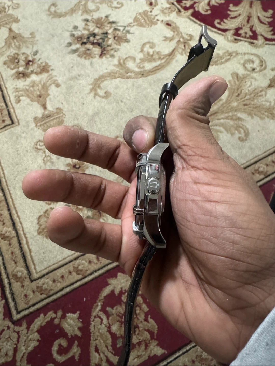 Selling a Bulova automatic watch with 21 jewels. It has a black leather strap and a silver-tone case. The watch is in good condition!
