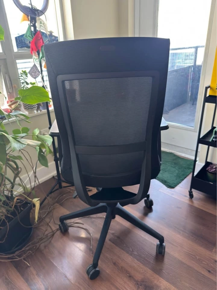 Ergonomic office/ desk chair with tilt recline, swivel wheels, adjustable arms, low-back support, and mesh back.