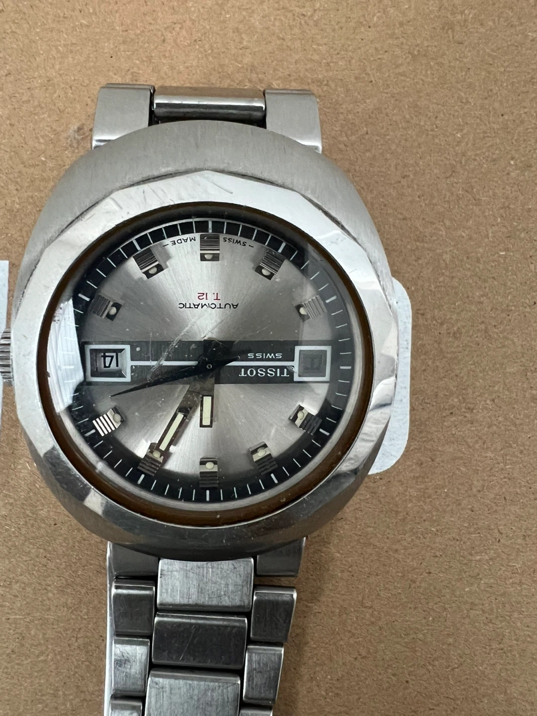 Selling a Tissot Automatic T.12 Swiss made watch. It's a stylish timepiece with a silver-tone finish and a unique design on the back. Great for collectors or everyday wear!