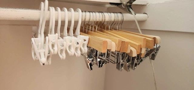 I am selling a collection of used clothing hangers in various styles and colours, perfect for organizing your wardrobe. These hangers have been previously used and are in good condition, ready to keep your clothes neat and tidy.