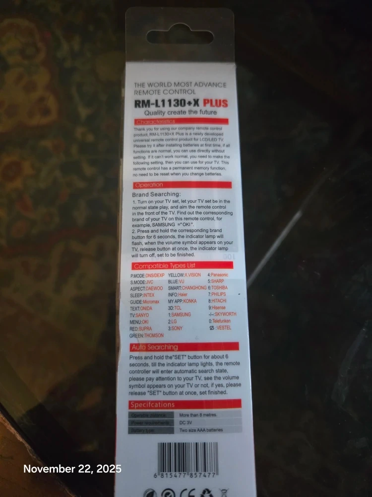 Selling a brand new, still in packaging, universal LED/LCD remote control, model RM-L1130+X PLUS! It's compatible with a wide range of TVs, including Samsung, LG, Sony, and more. It supports Netflix, YouTube, and Amazon Smart TV functions. The remote requires two AAA batteries.