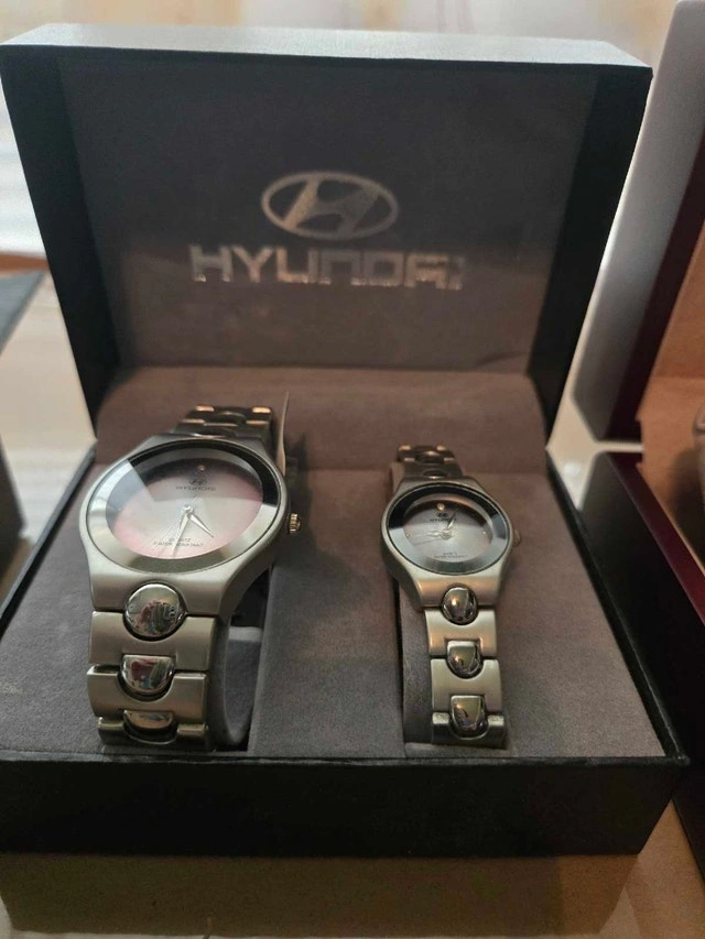 For sale is a set of Hyundai watches, including both a men's and a women's model, each featuring a sleek metal band. These watches are in used condition. Let me know if you're interested!