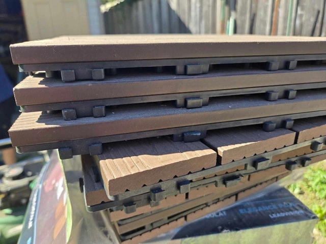 I'm offering 6 boxes (1 box open, but never use) of Leadvision Elegance Plus composite patio tiles in chocolate. Each tile measures 12" x 12" x 0.85", with 10 tiles per box. These tiles feature a four-way locking system, are anti-corrosion, and made of high-density polyethylene, ensuring low maintenance.