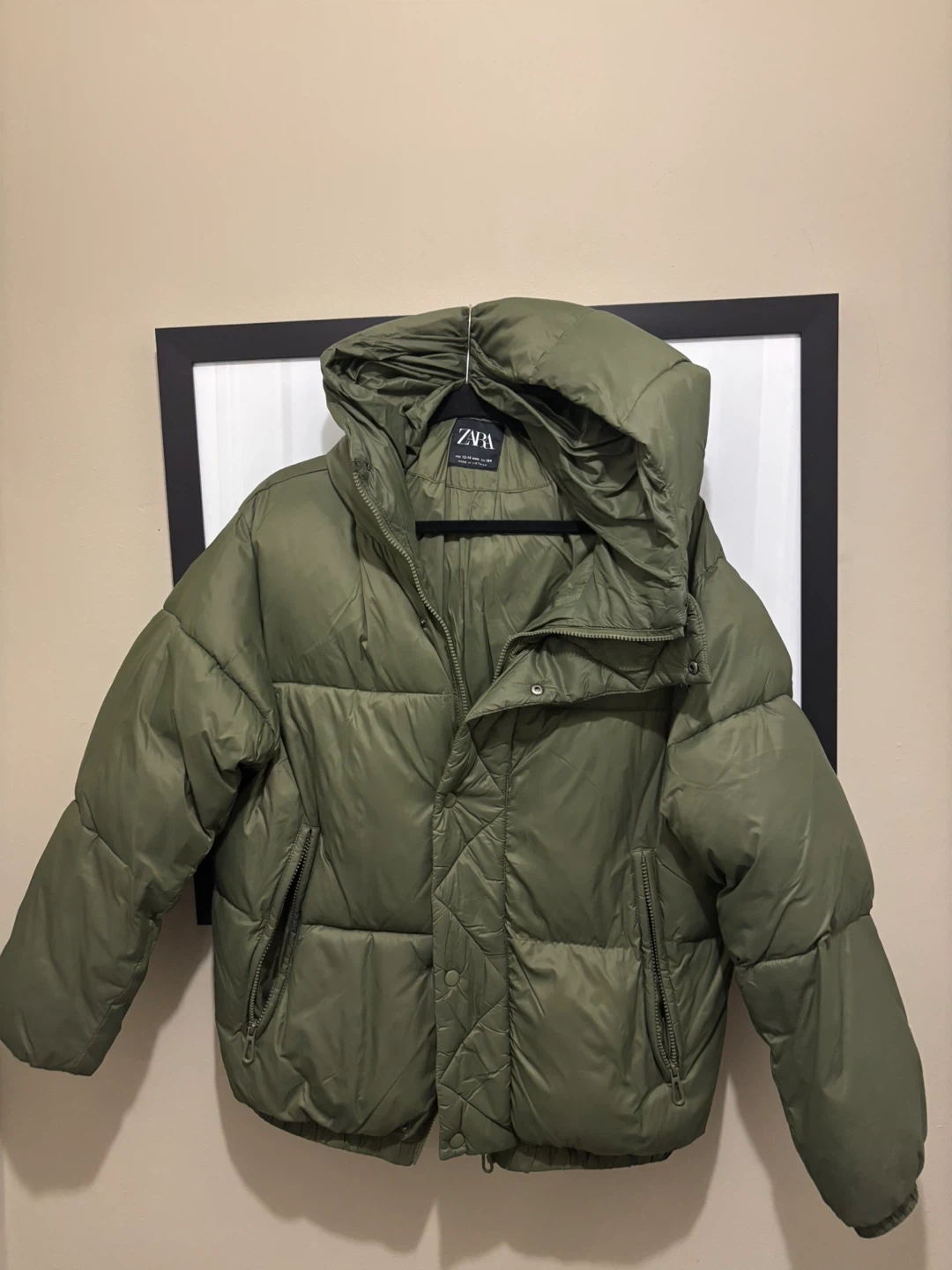 Selling a Zara puffer jacket in olive green! The size is 13-14, which is equivalent to a height of 164 cm. It's in great condition and perfect for staying warm during the colder months