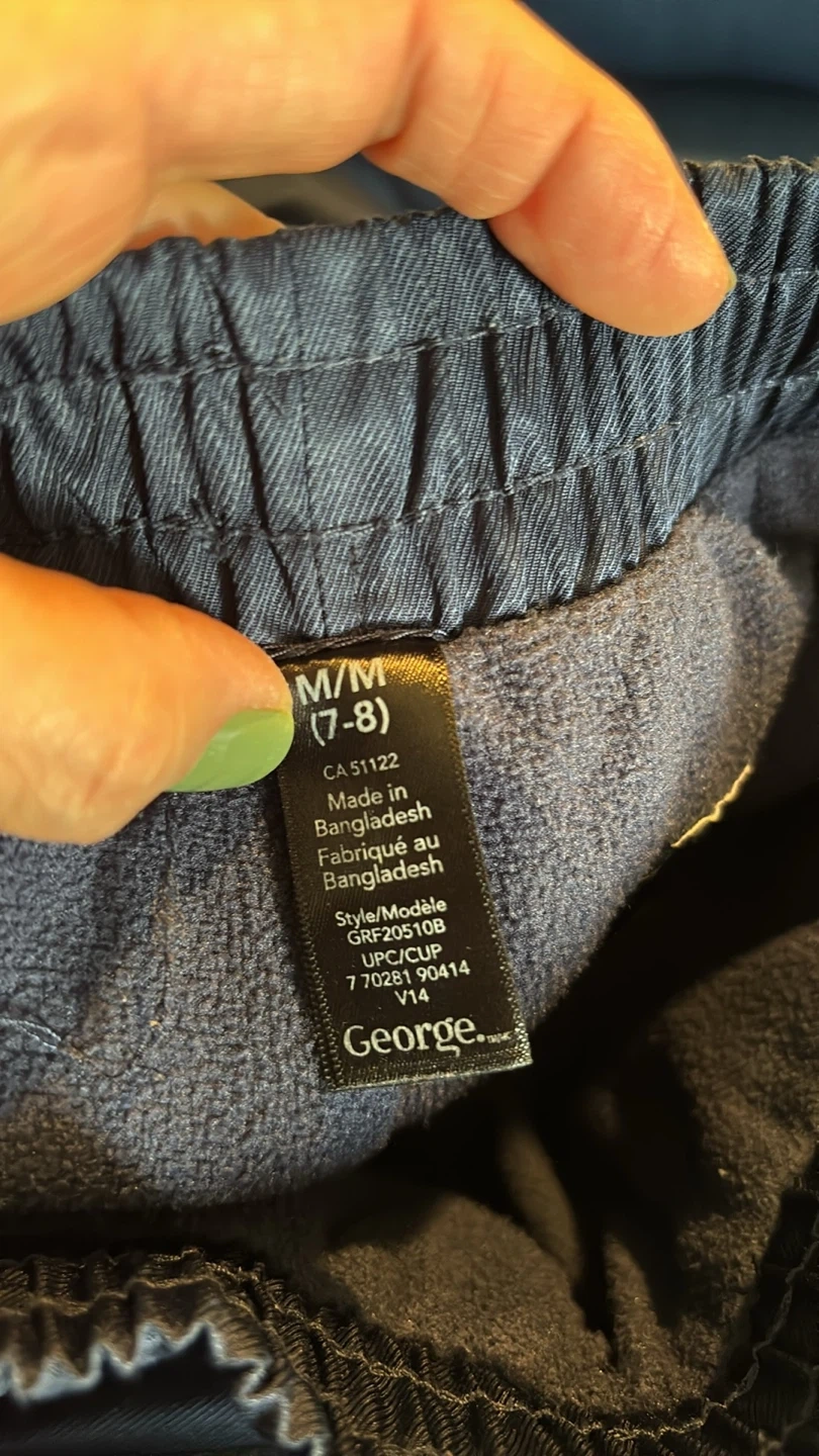 George snow pants in size M/M (7-8). They're a nice navy blue colour and look like they're in great shape! Perfect for keeping your little one warm and dry this winter season