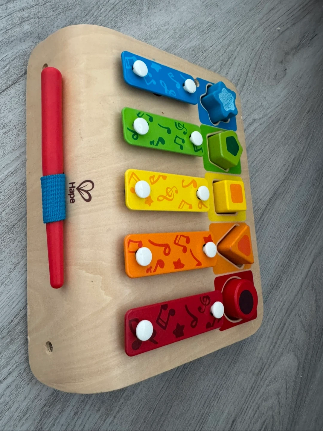 Selling a Hape Pound & Tap Bench with Slide Out Xylophone! It's in great condition and ready for a new home. This toy is great for developing fine motor skills and musical creativity in young children. The set includes a xylophone, hammer, and shape sorter, providing multiple ways to play and learn. Recommended for ages 12 months and up, it's a perfect way to introduce your little one to music and shapes