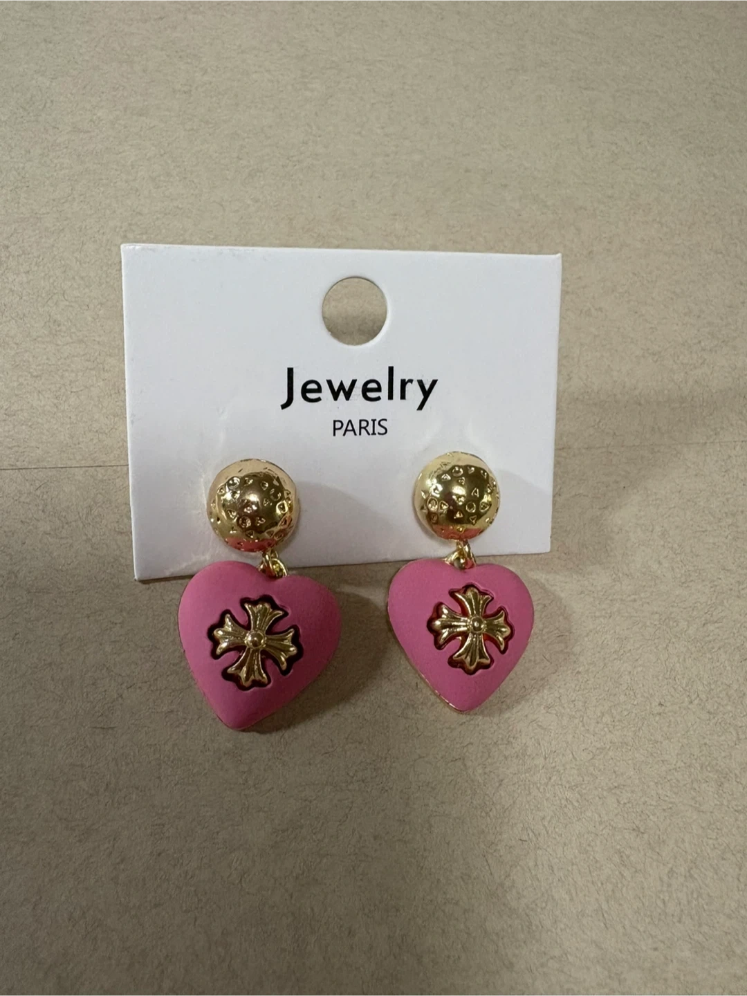 Cute pink heart earrings from Jewelry Paris! These earrings feature a gold-tone stud and a pink heart pendant with a cross design. They're in great condition and ready to add a pop of colour to your outfit