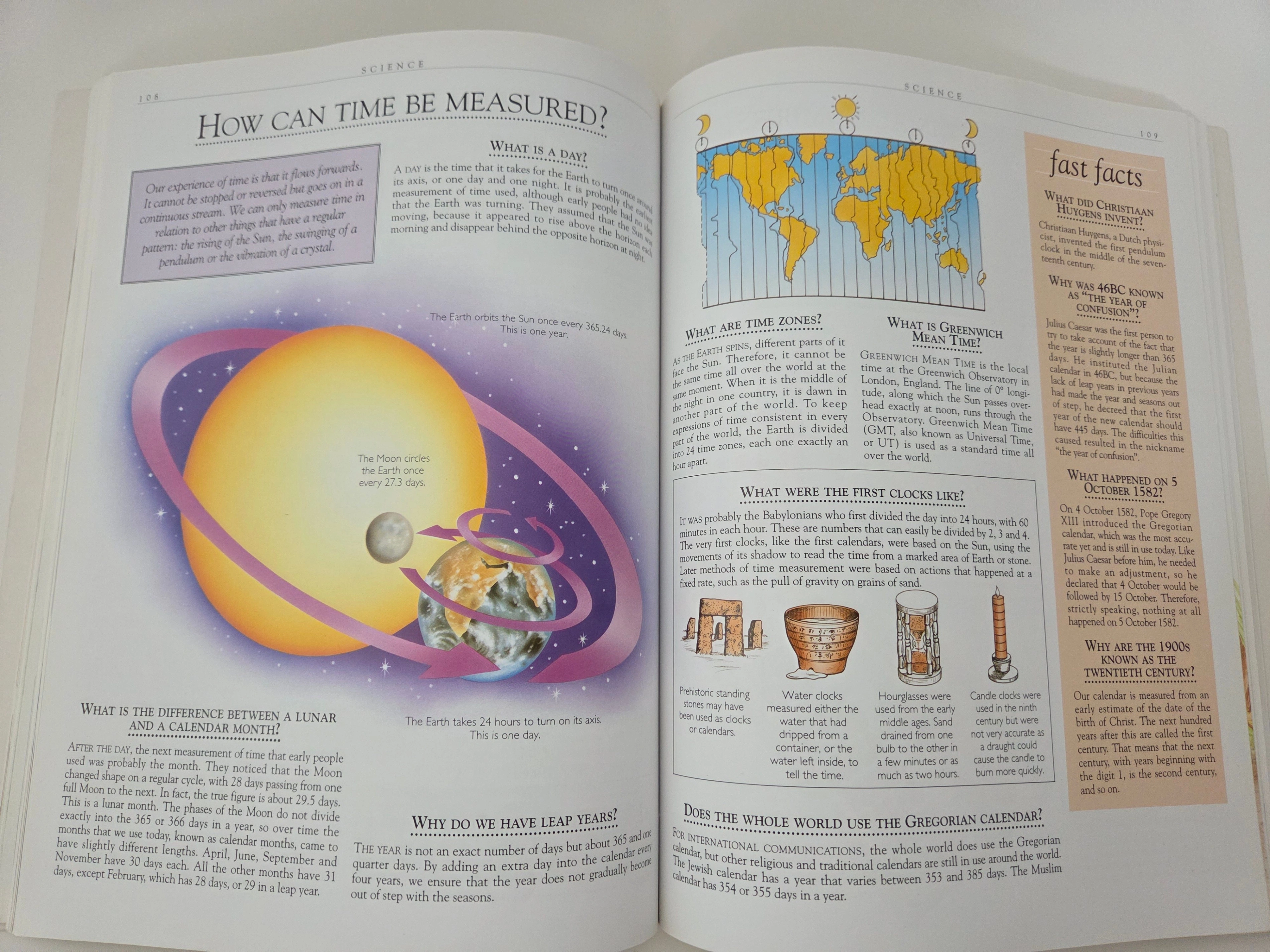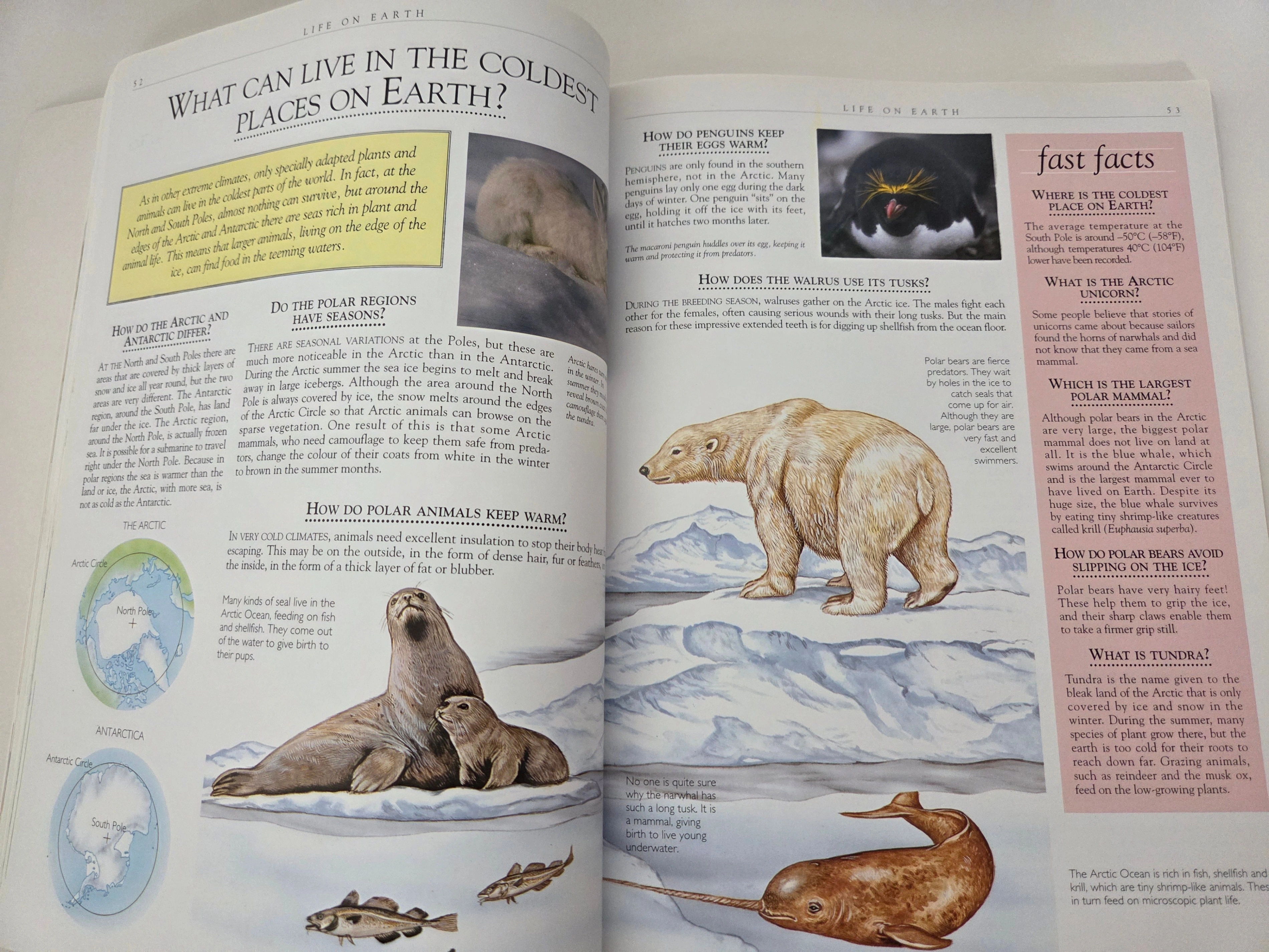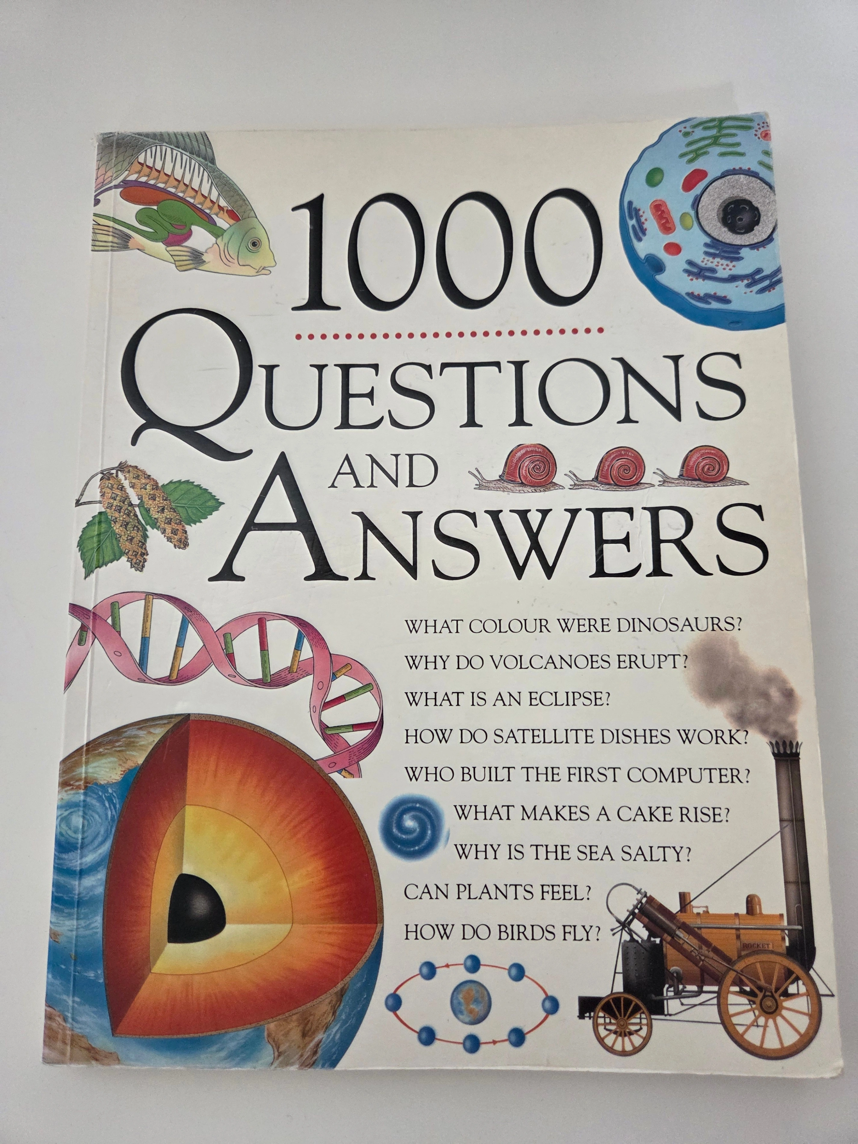 Big, friendly reference packed with bite-size facts and colorful art. “1000 Questions and Answers” covers three areas: Life on Earth, Science, and How Things Work. Examples inside: How can time be measured? What makes up the air we breathe? What can live in the coldest places on Earth? Clear diagrams of the Earth’s layers, DNA, time zones, animals, simple machines and more.