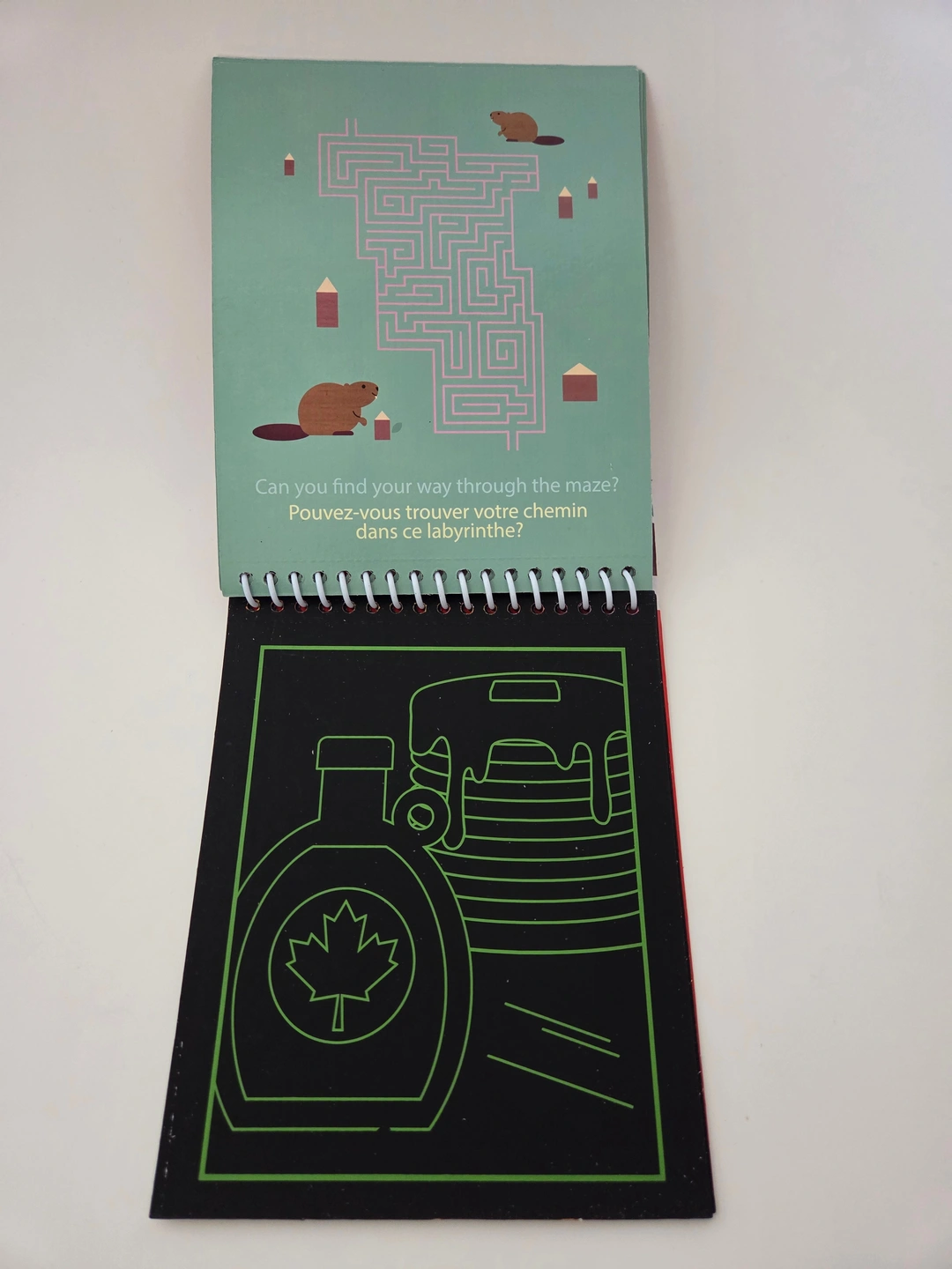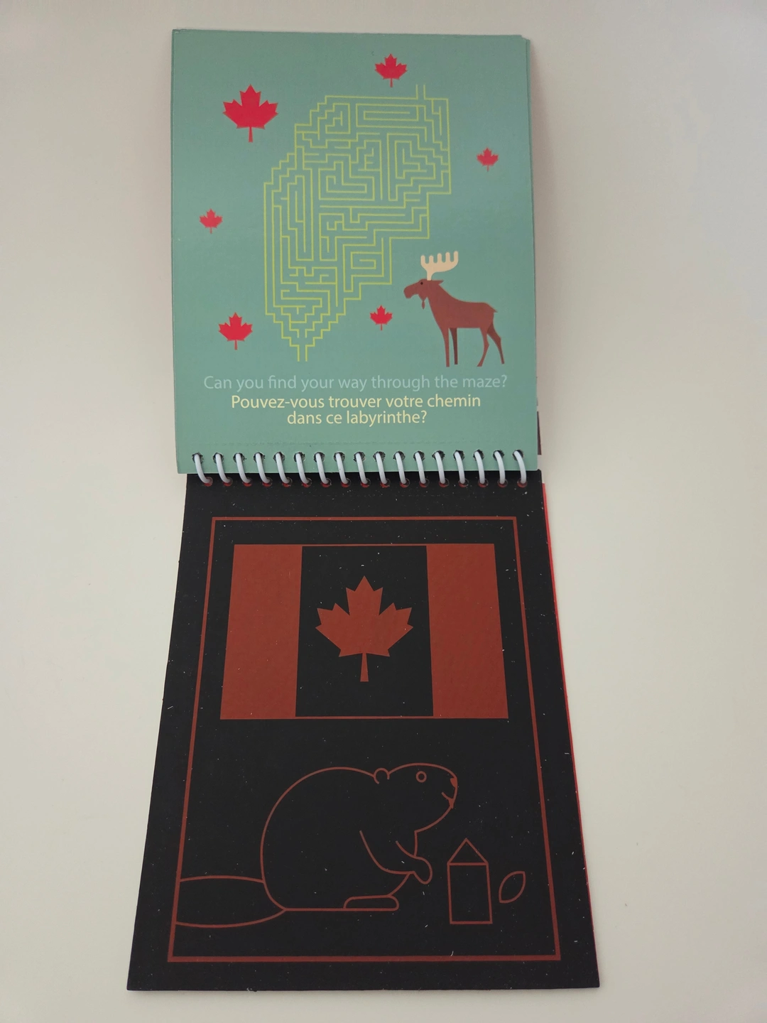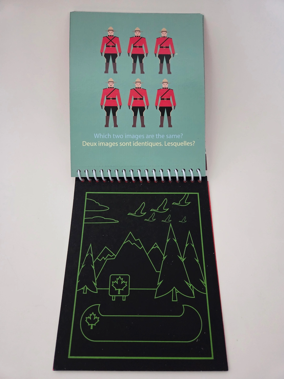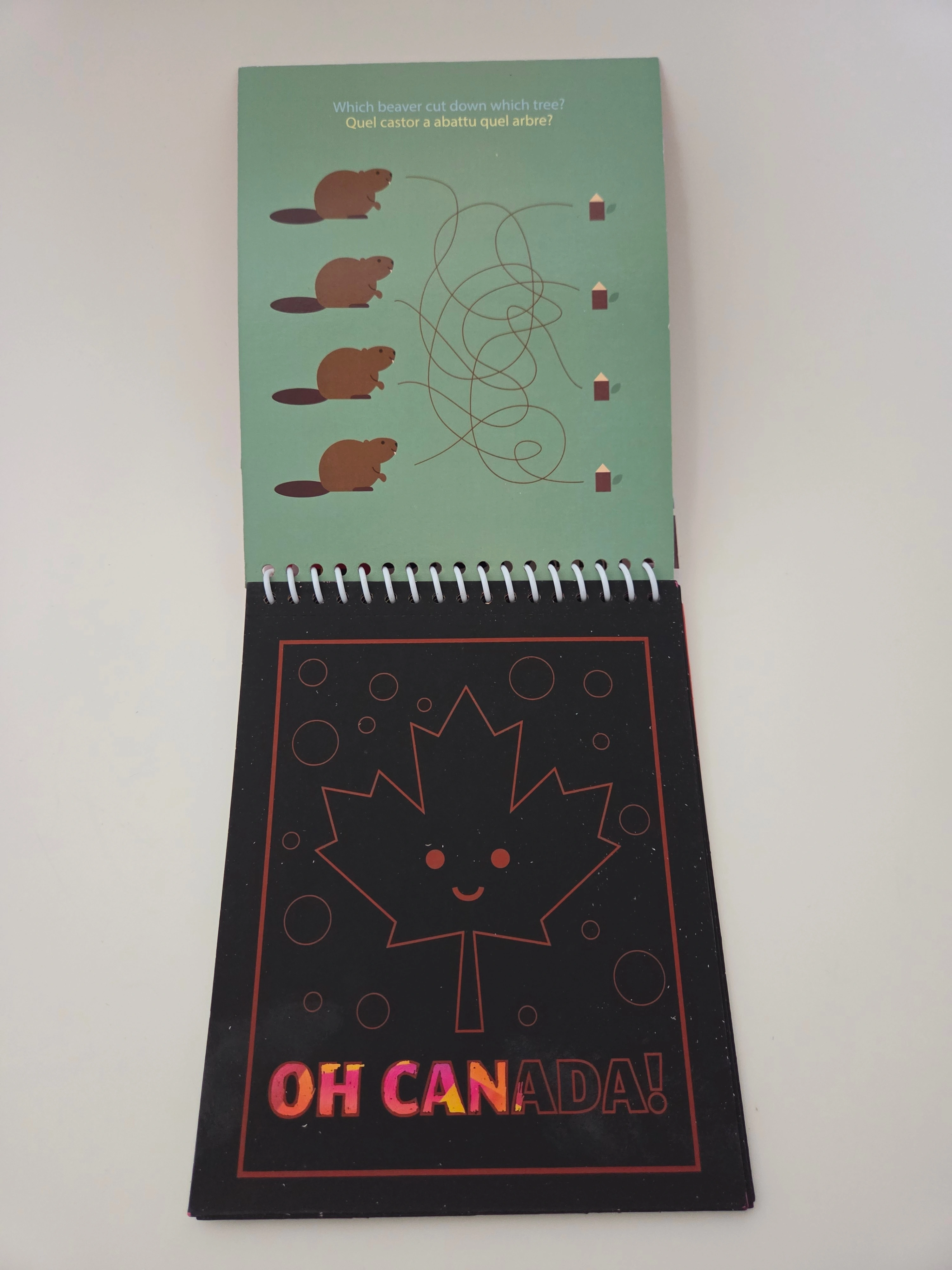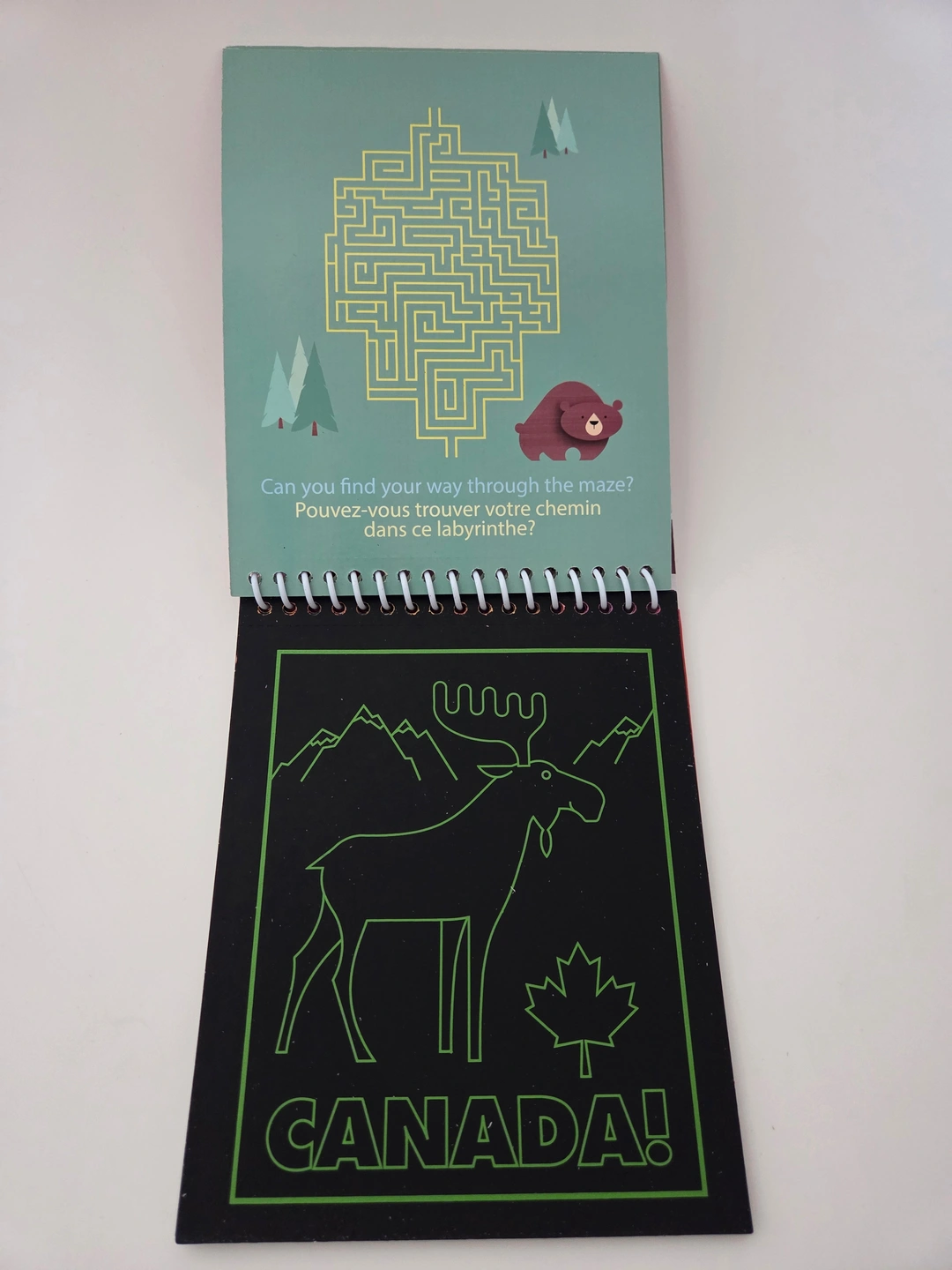 Fun scratch-art activity book with a Canada Day theme. Spiral-bound pad with 6 rainbow-foil scratch pictures. Bilingual EN/FR mini games on the reverse pages. Scenes include: maple leaf with “OH CANADA!”, moose, Mountie, beaver and flag, maple-syrup bottle with pancakes, and a canoe landscape.