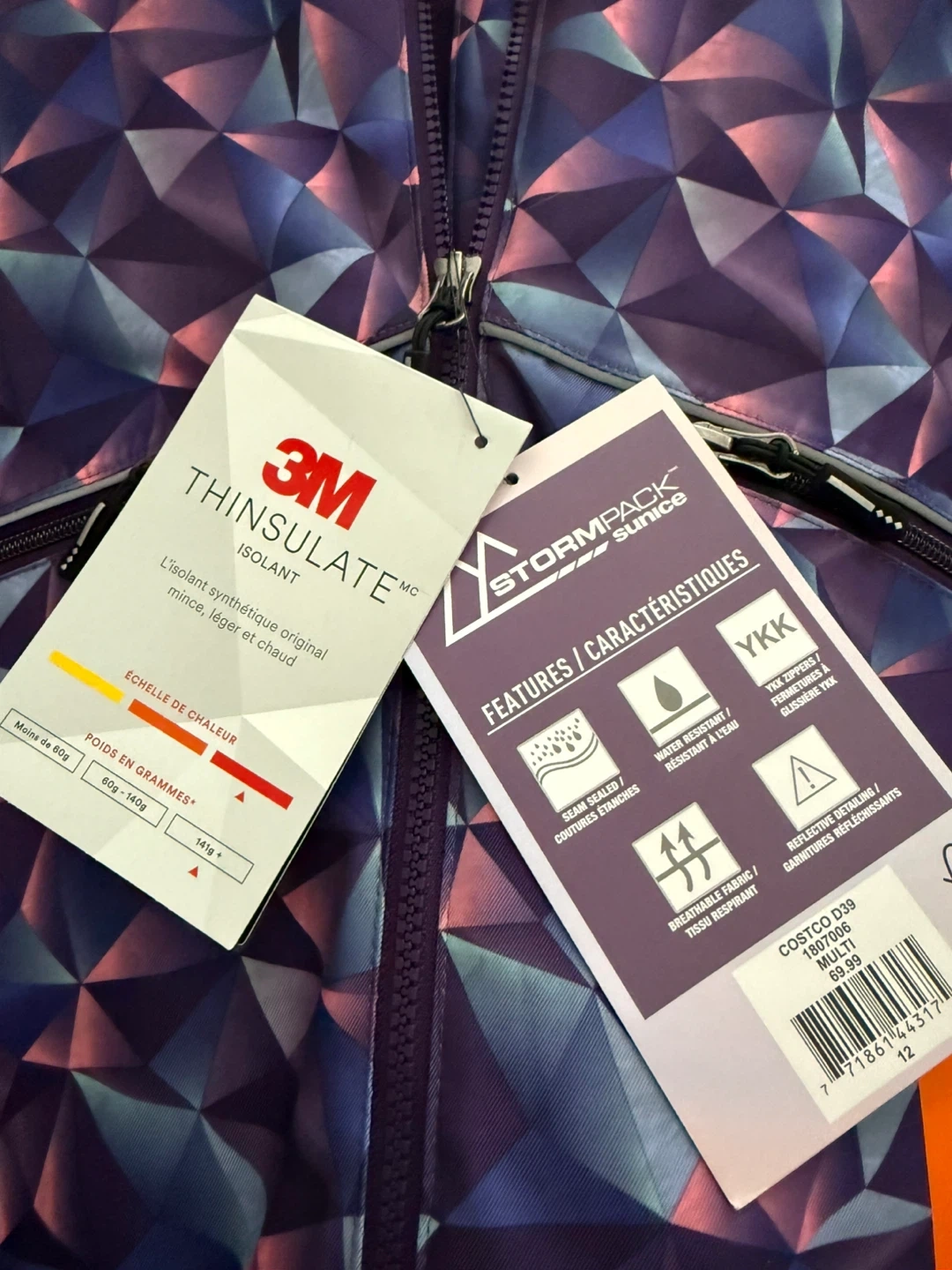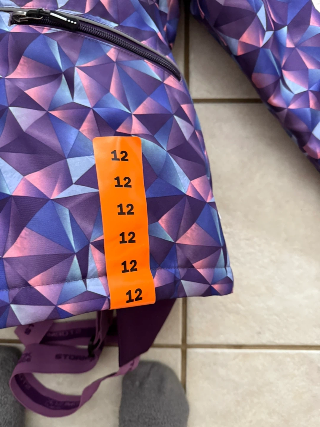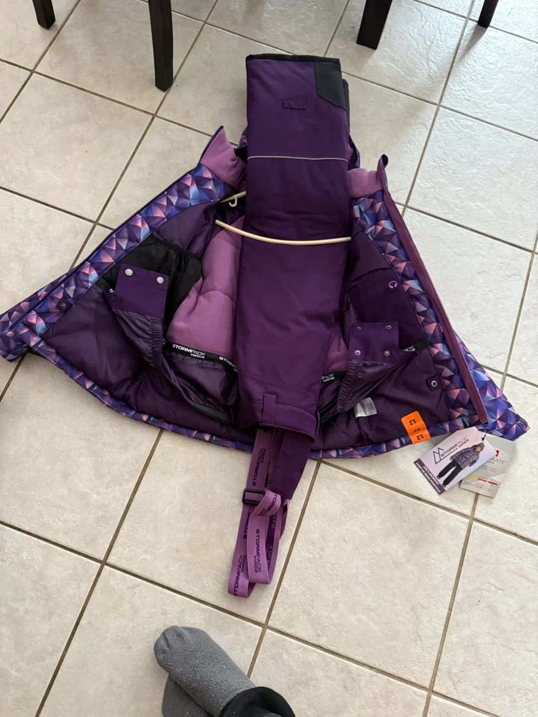 Brand new never worn tag still attached ! Girls' Storm Mountain snowsuit in size 12! It's a vibrant purple colour with a geometric pattern. The jacket features 3M Thinsulate insulation to keep your little one warm and cozy on the slopes or during winter playtime. Comes with matching snow pants!
