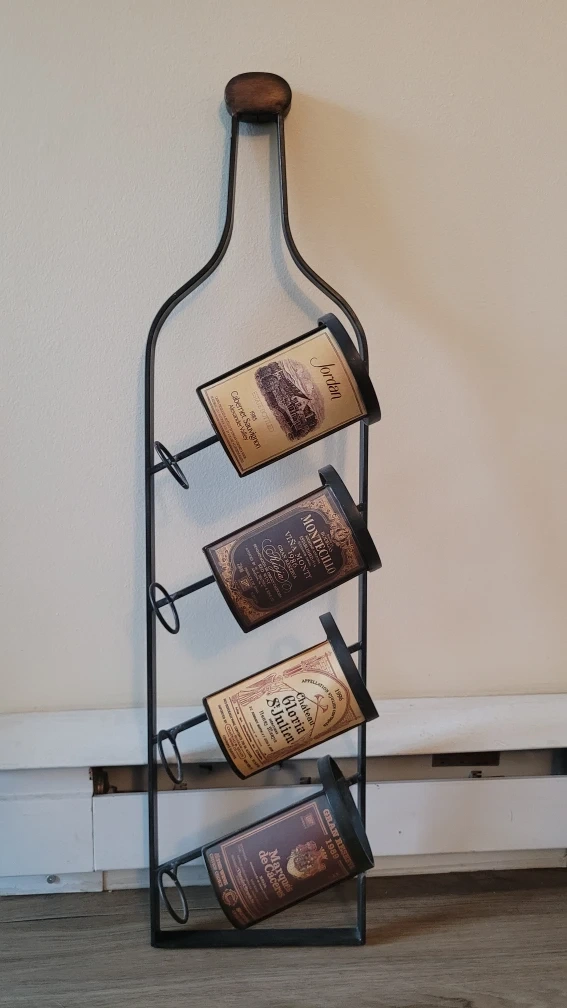 Here's a unique wine rack shaped like a wine bottle! It's made of metal and holds four bottles of wine. It would be a great addition to any kitchen or dining room