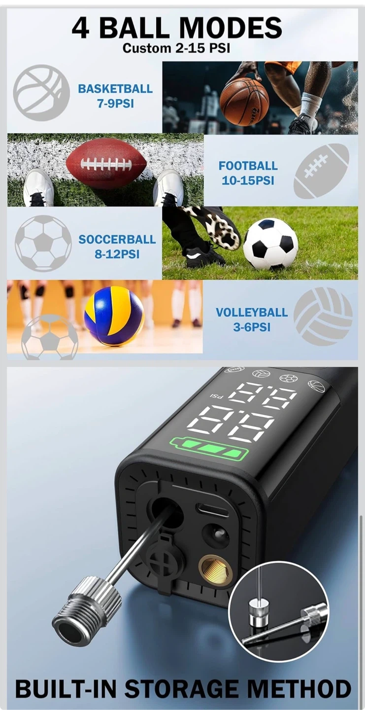 Electric Ball Pump for Sport Ball,2000mAh 15 PSI Portable Automatic Air Pump Fast Ball Inflator with 2 Needles,Precise Pressure Gauge for Basketball Football Volleyball Soccer