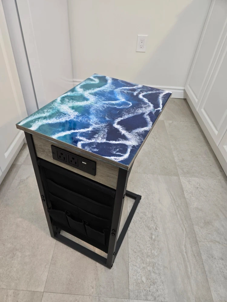 This C table features a beautiful ocean blue design on top and a sturdy black metal frame. It's perfect for placing next to your couch or bed. It also has built-in USB ports for charging your devices!