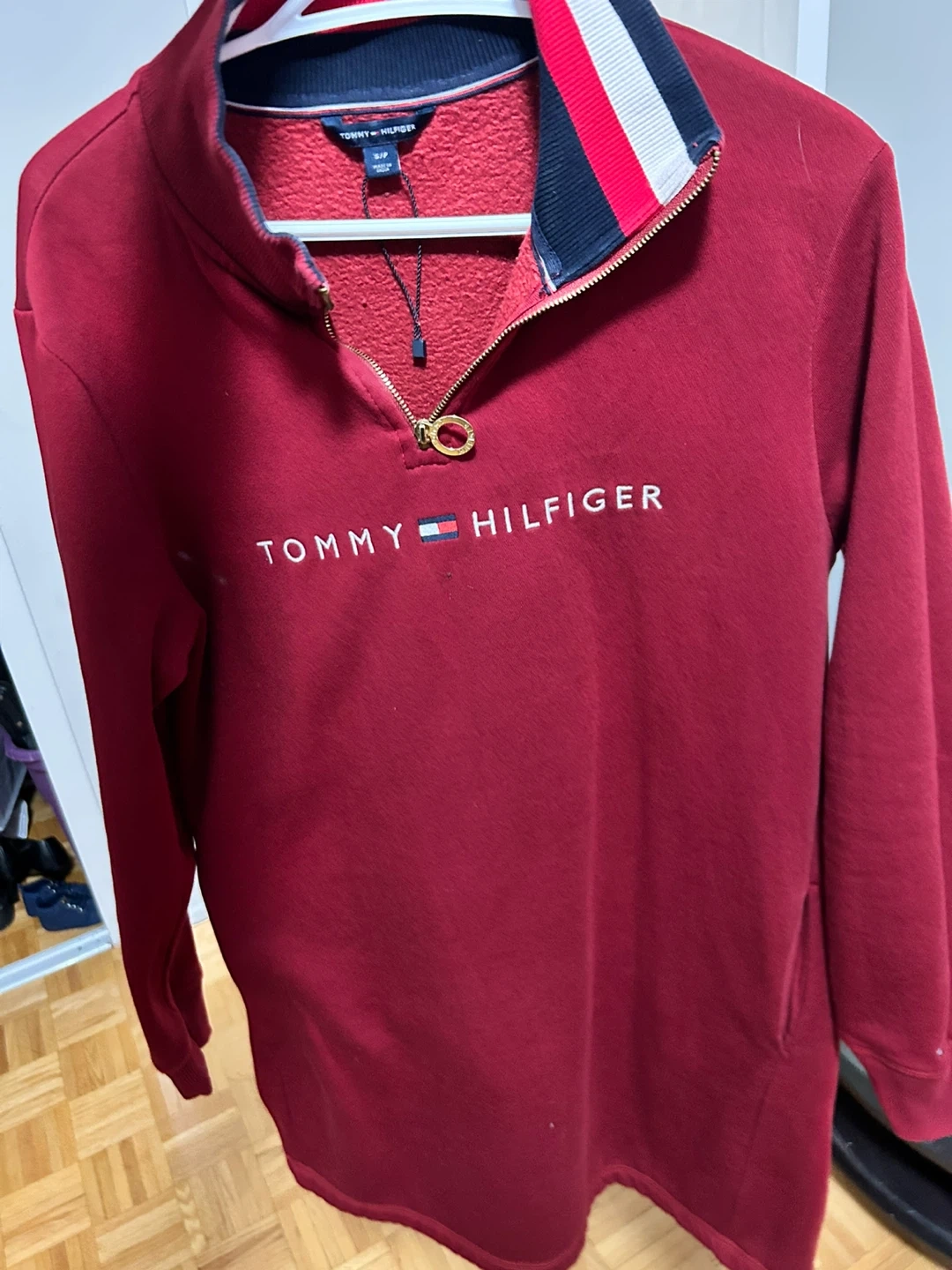 Selling a Tommy Hilfiger pullover dress in a lovely red colour! It's a size small and features the classic Tommy Hilfiger logo. Perfect for a casual and comfortable look!
