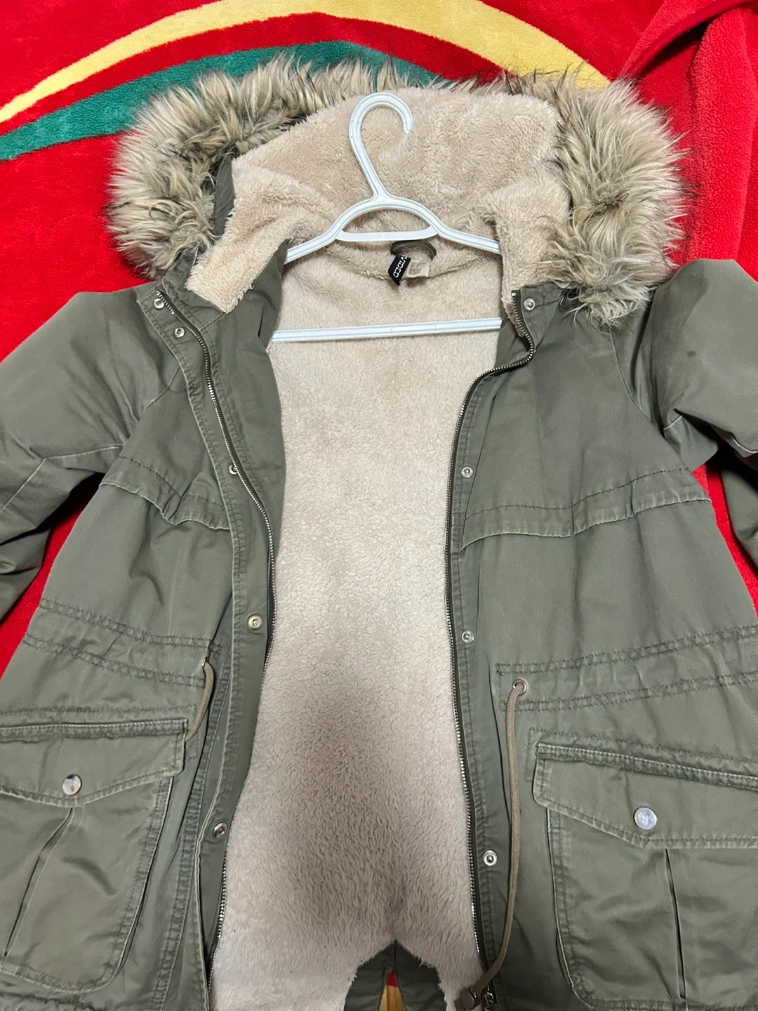 Selling a cozy H&M winter parka in olive green! It's a size 10 and features a faux fur-trimmed hood and a soft, plush lining to keep you warm during those chilly Canadian winters