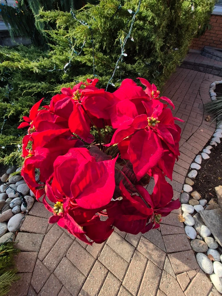 Beautiful red artificial poinsettia plant ready to brighten up your space! It's in great condition and comes with a pot filled with decorative stones. Very real look and feel. 38 inches high.