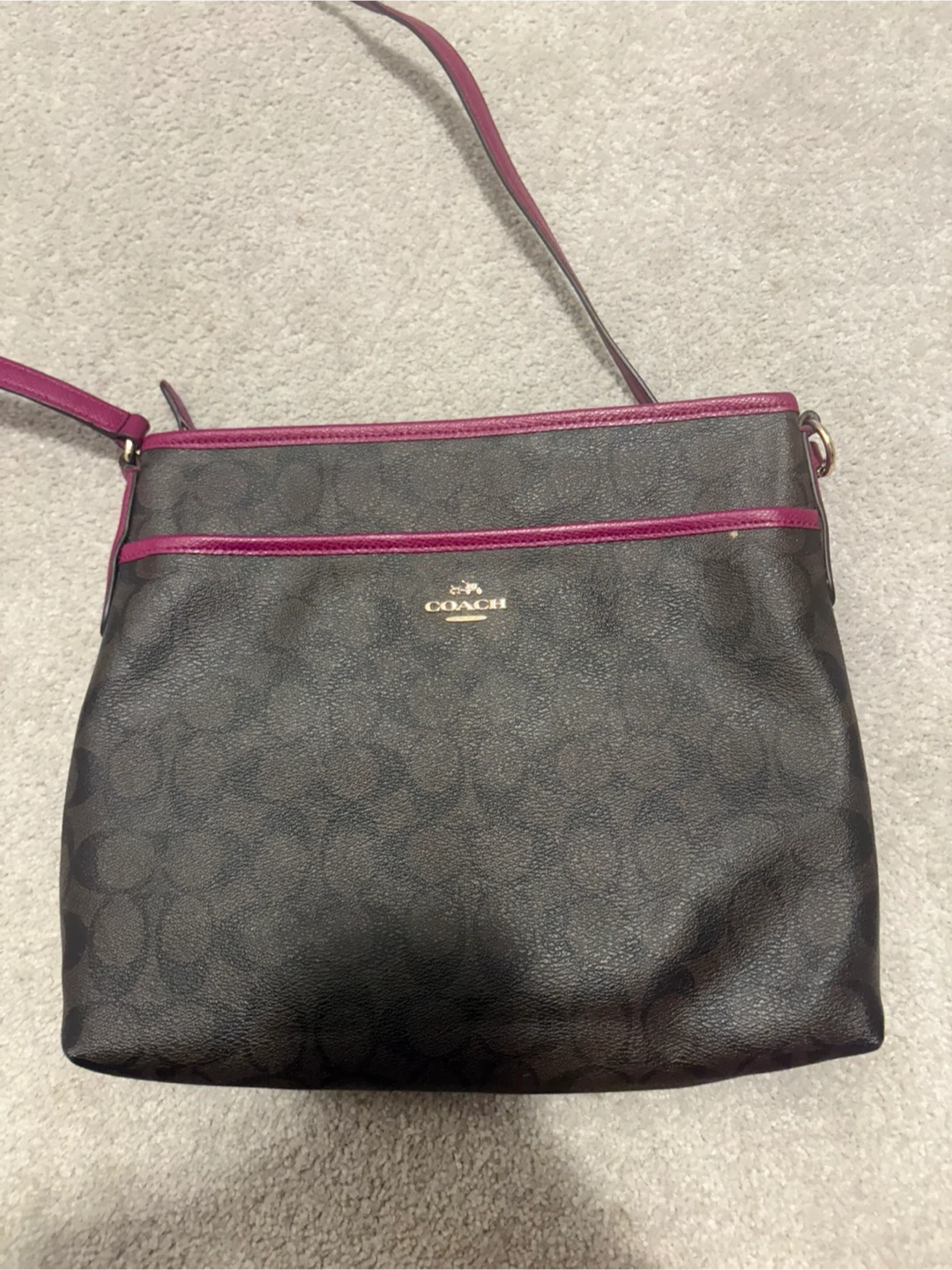 Selling a Coach crossbody bag! It's in great condition and perfect for everyday use. The bag features the classic Coach logo pattern and a vibrant magenta trim, adding a pop of colour to your outfit