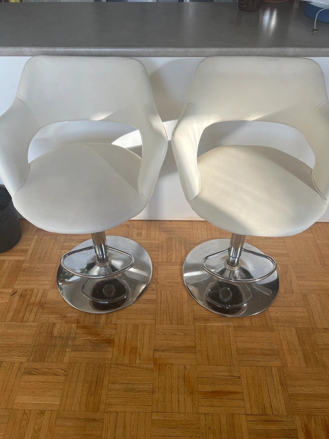 Selling a pair of swivel bar stools. They are white with a chrome base. There are some signs of wear and tear, as shown in the photos.
