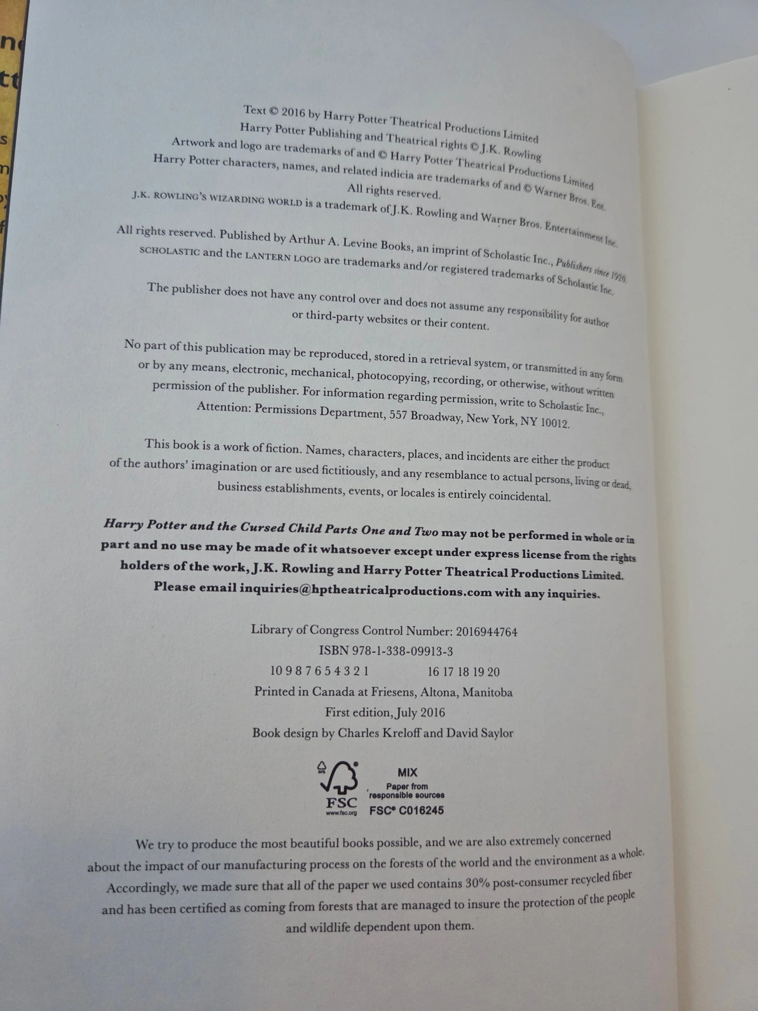 First edition, first printing of the Special Rehearsal Edition Script of “Harry Potter and the Cursed Child – Parts One and Two.” Hardcover with dust jacket, published by Arthur A. Levine Books, an imprint of Scholastic. Printed in Canada at Friesens, Altona, Manitoba in July 2016.