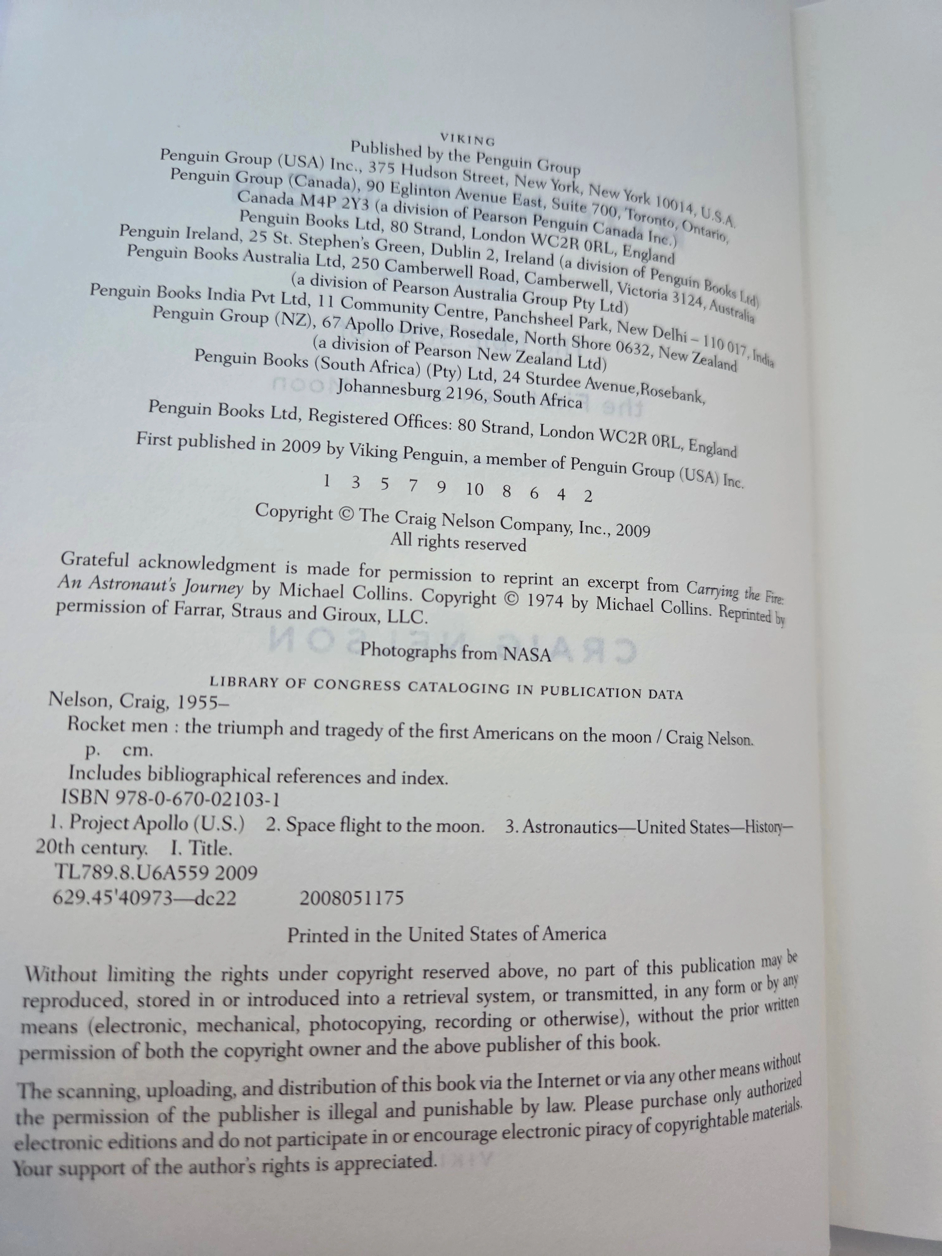 Rocket Men: The Epic Story of the First Men on the Moon by Craig Nelson – Viking, 2009. Hardcover copy in good, clean shape. No dust jacket. Light shelf wear to the boards and corners, tight binding.