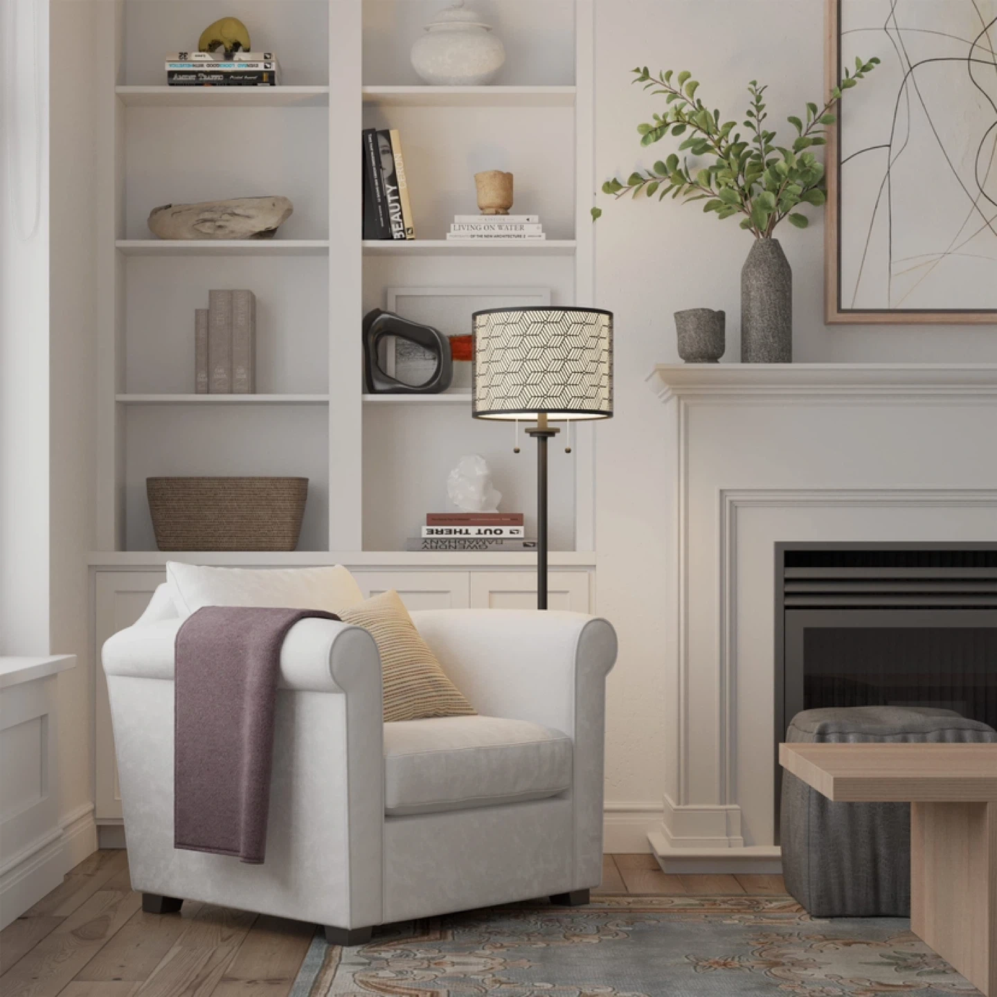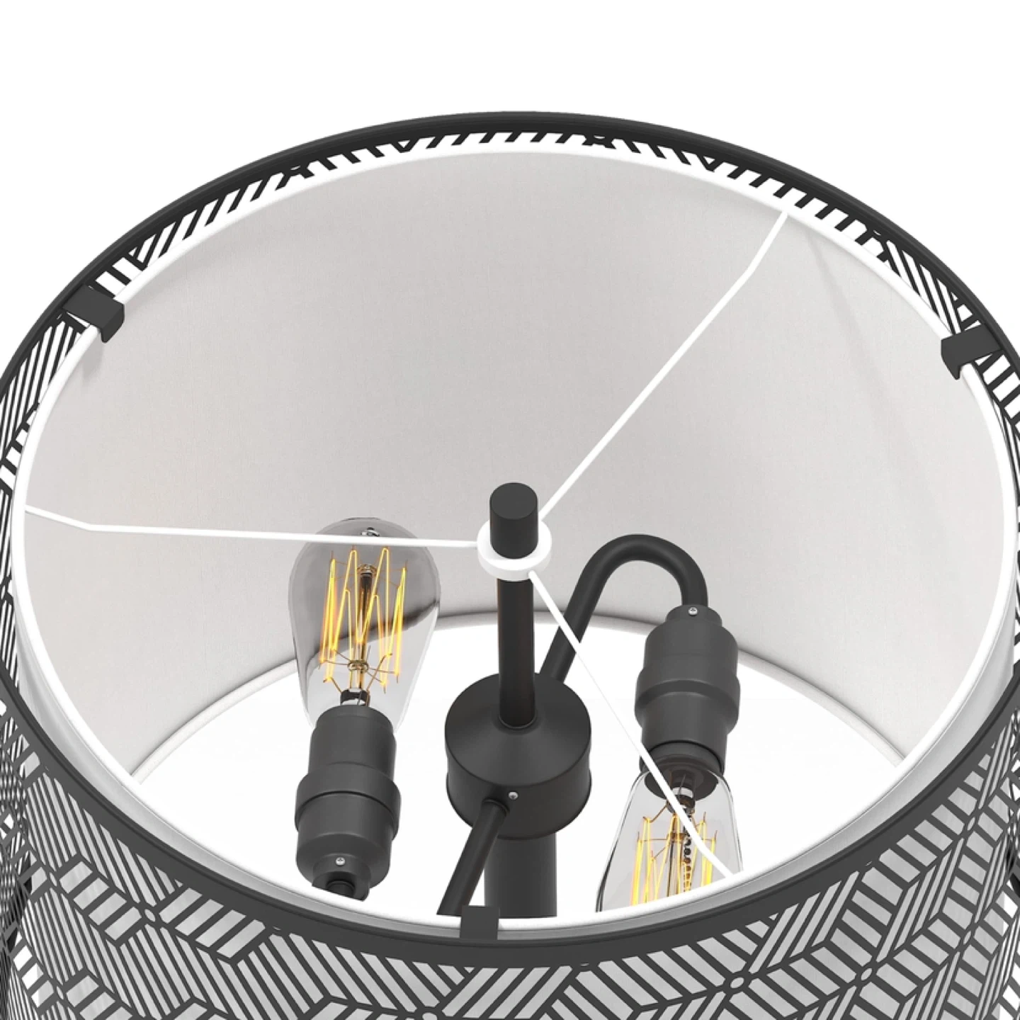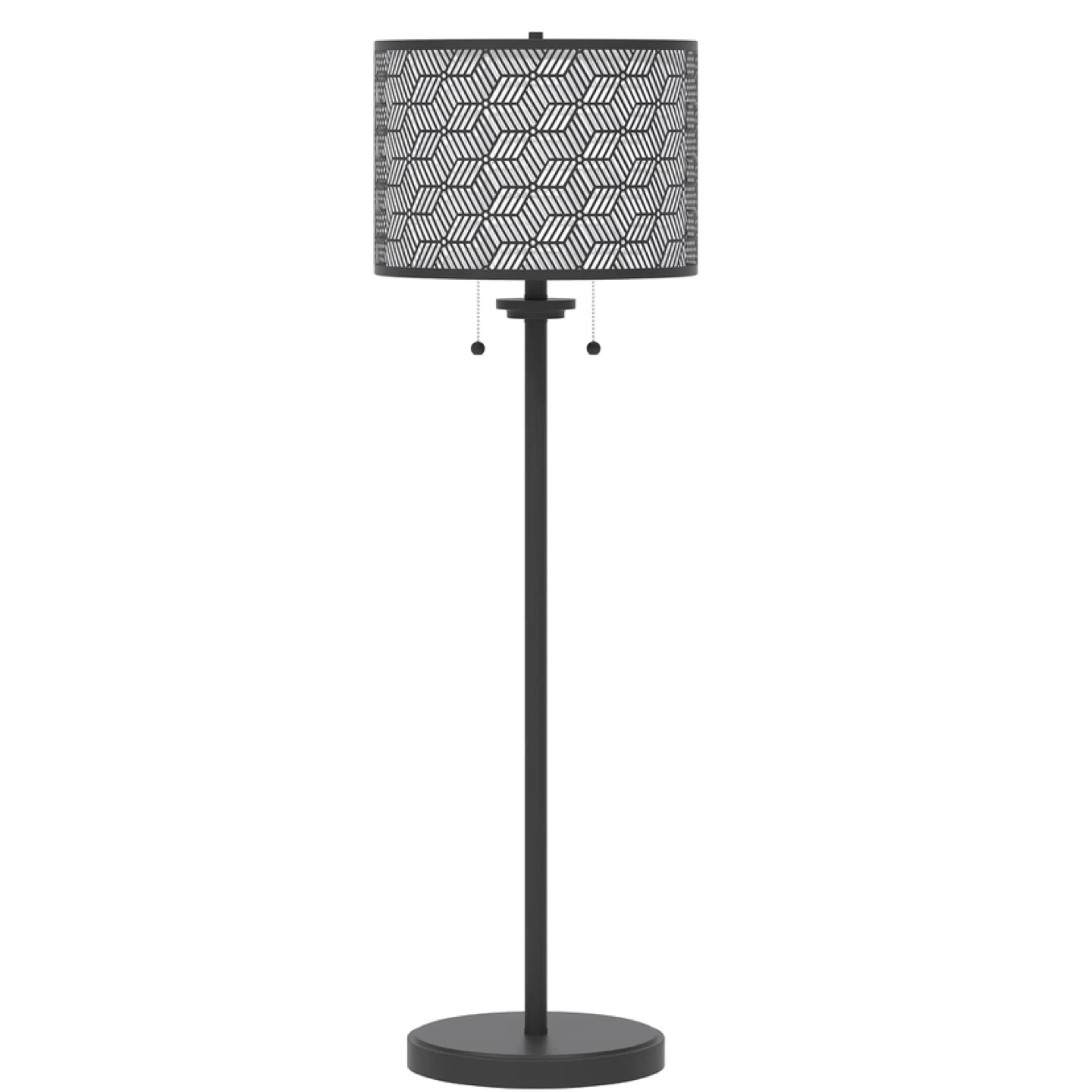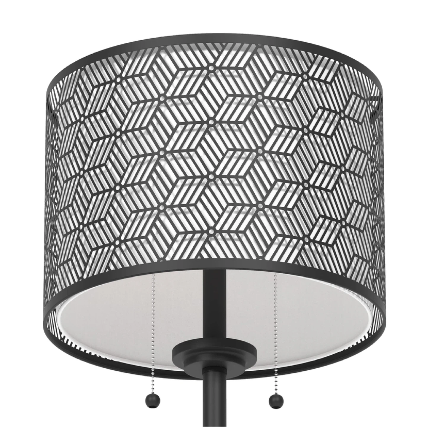 Metal base and columns come in black finish. Black cutout pattern metal outer shade paired with white fabric hardback inner shade. Black power cord in 6 ft length.
