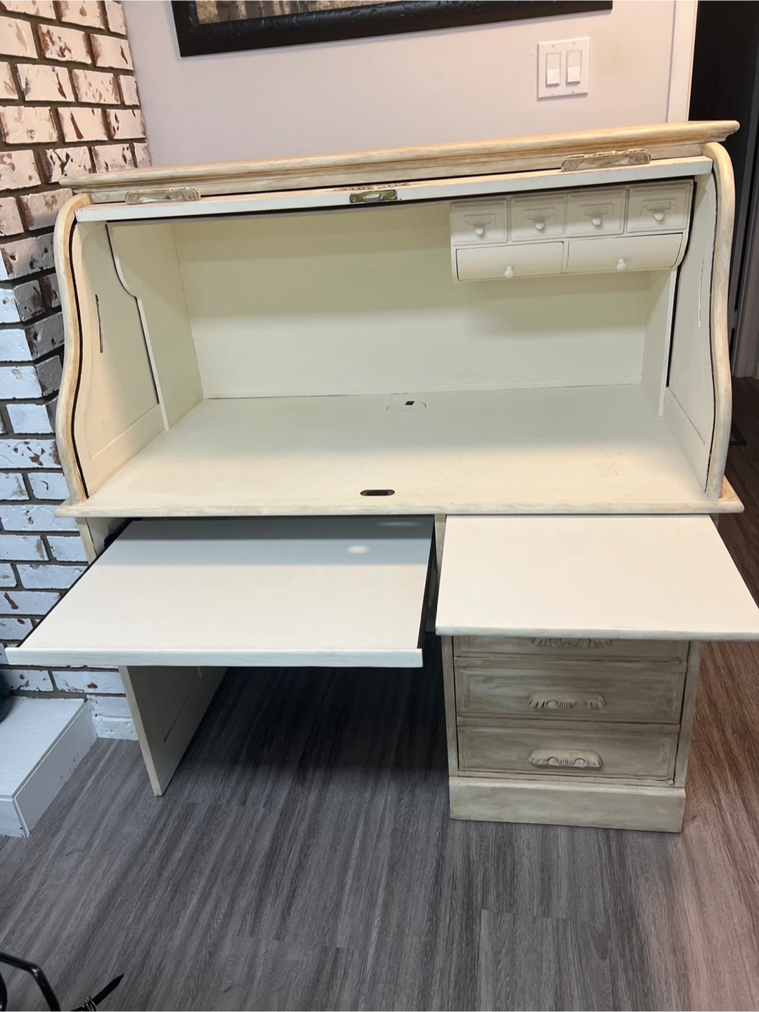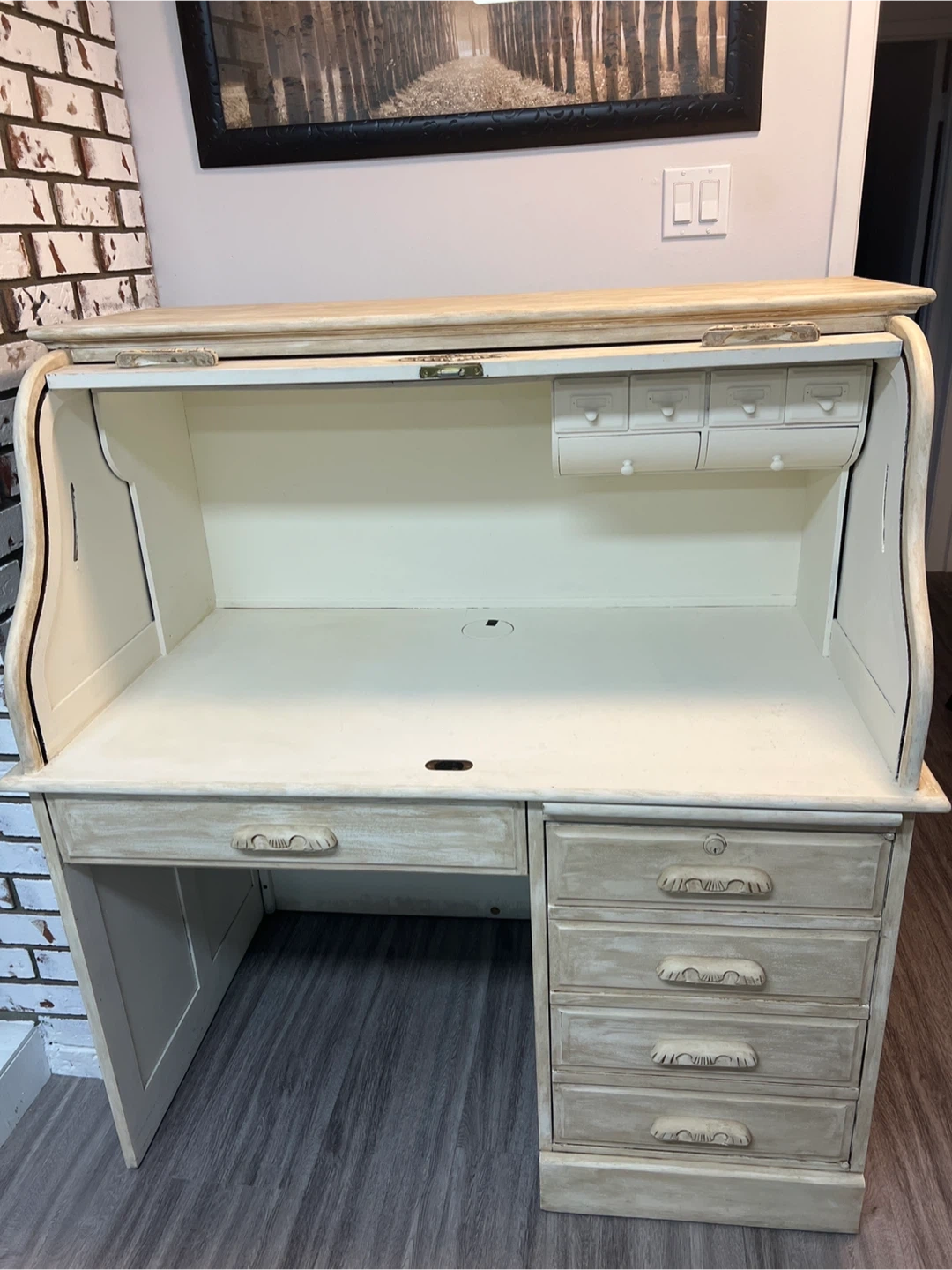 Selling a charming roll top desk. It features a unique design with a roll-up top and several drawers for storage. Perfect for adding a touch of vintage style to your home office or study space