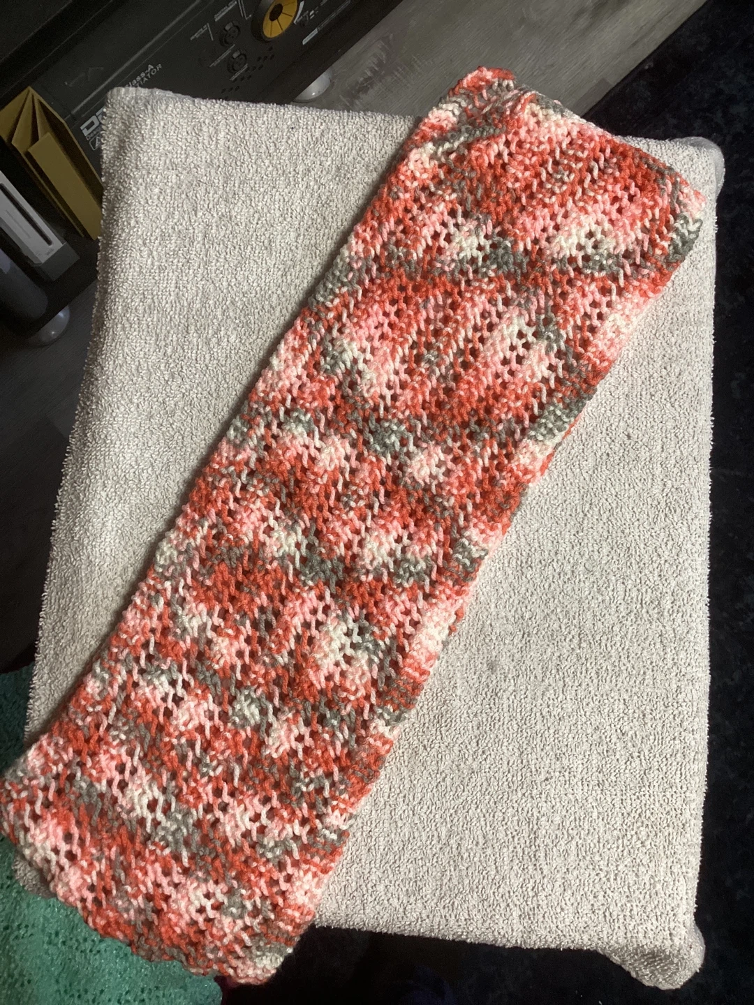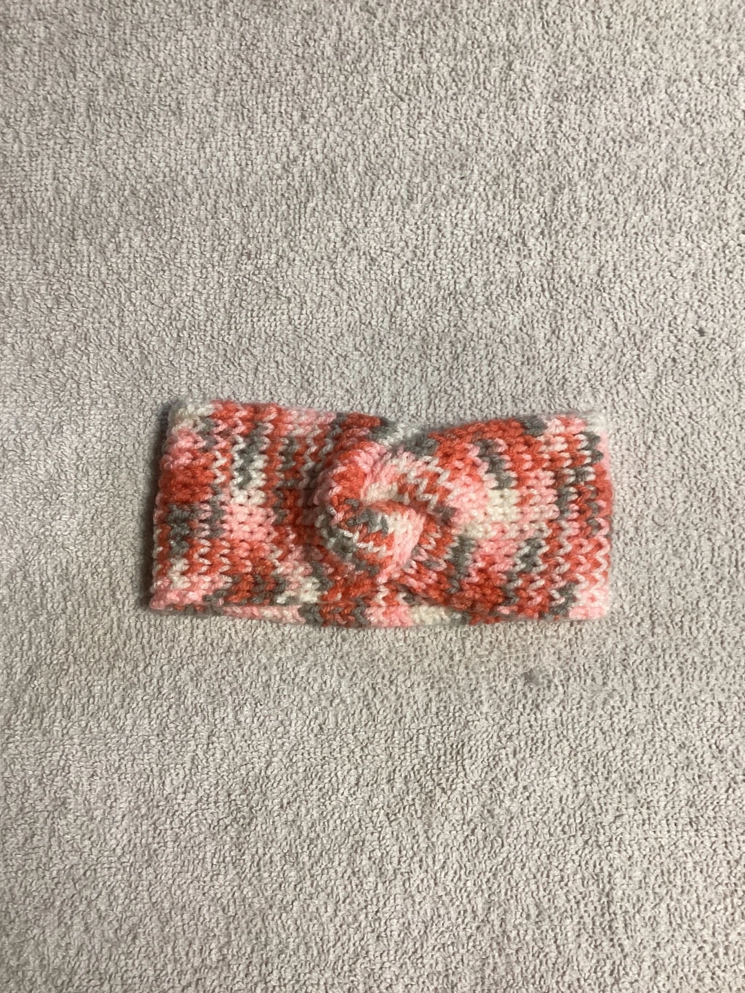 Selling a cozy handmade knitted set! Includes a hat with a pompom, a scarf, and a cute headband. Perfect for staying warm and stylish during the colder months. The set features a unique blend of coral, pink, white, and grey colours. Great condition!