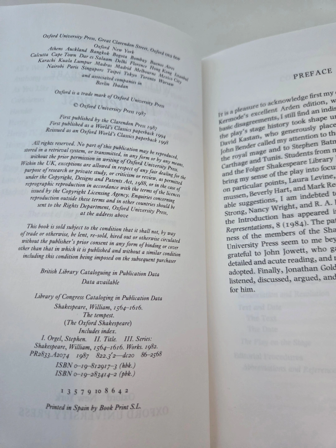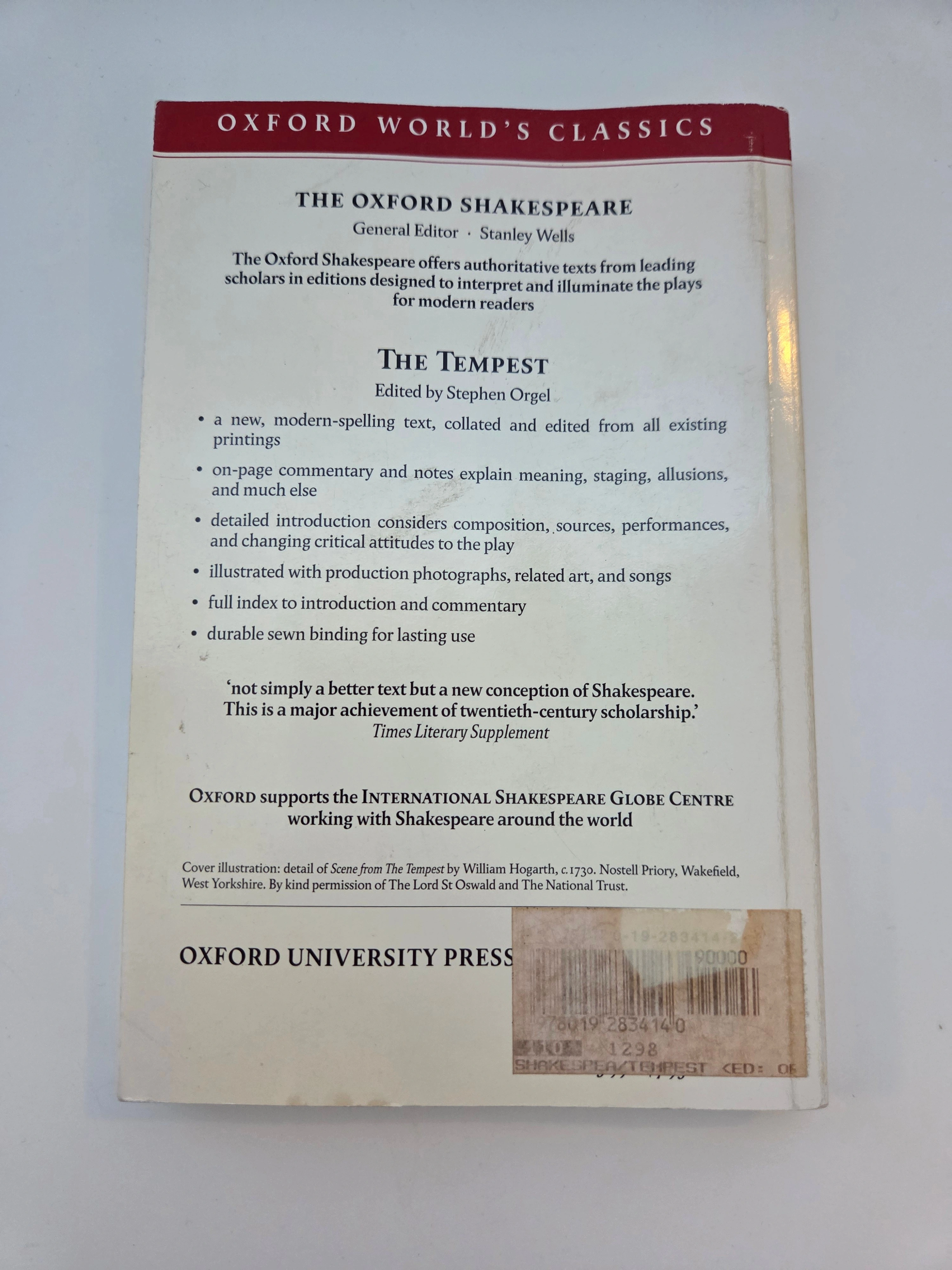 A reliable study copy of Shakespeare’s The Tempest from Oxford World’s Classics. Edited by Stephen Orgel, this edition presents a modern-spelling text with extensive on-page notes and a substantial introduction that covers genre, sources, staging, politics, and reception. Useful appendices include material on the seamanship of Act 1, the Strachey Letter, selections from Montaigne and Ovid, notes on the music, lineation, and a full index – perfect for coursework or theatre prep. Durable sewn binding. Printed in Spain for Oxford University Press.