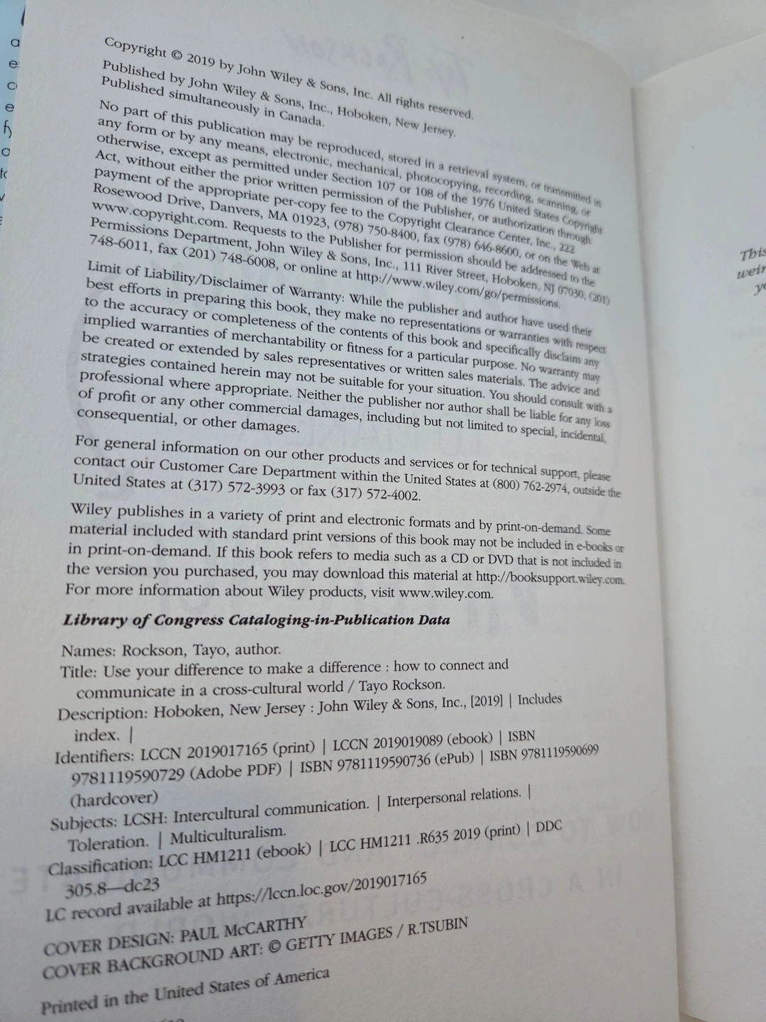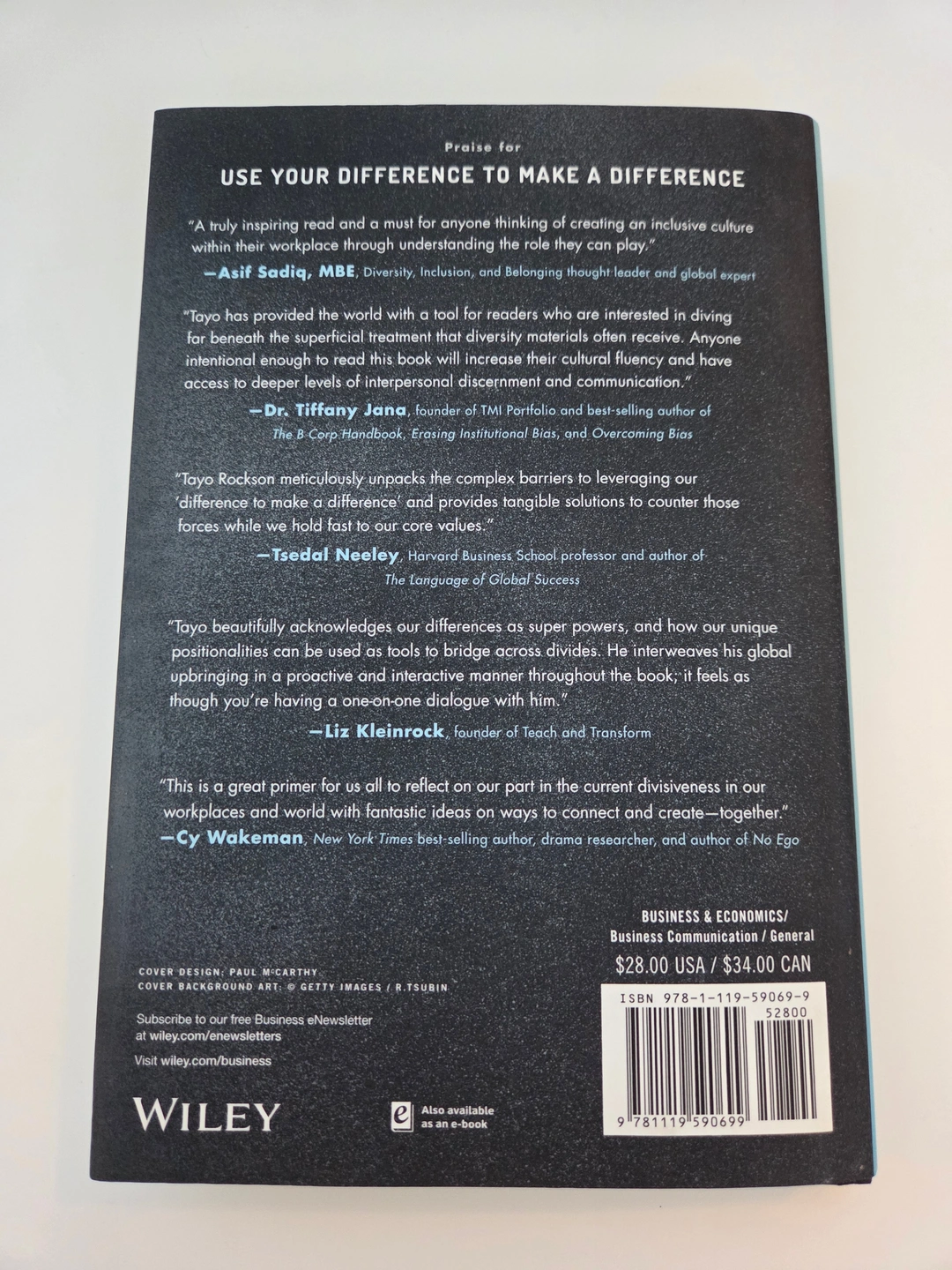 Hardcover copy of “Use Your Difference to Make a Difference” by Tayo Rockson – published by Wiley in 2019 (published simultaneously in Canada). A practical guide to cross-cultural connection, DEI and inclusive communication for leaders, HR, educators and students.