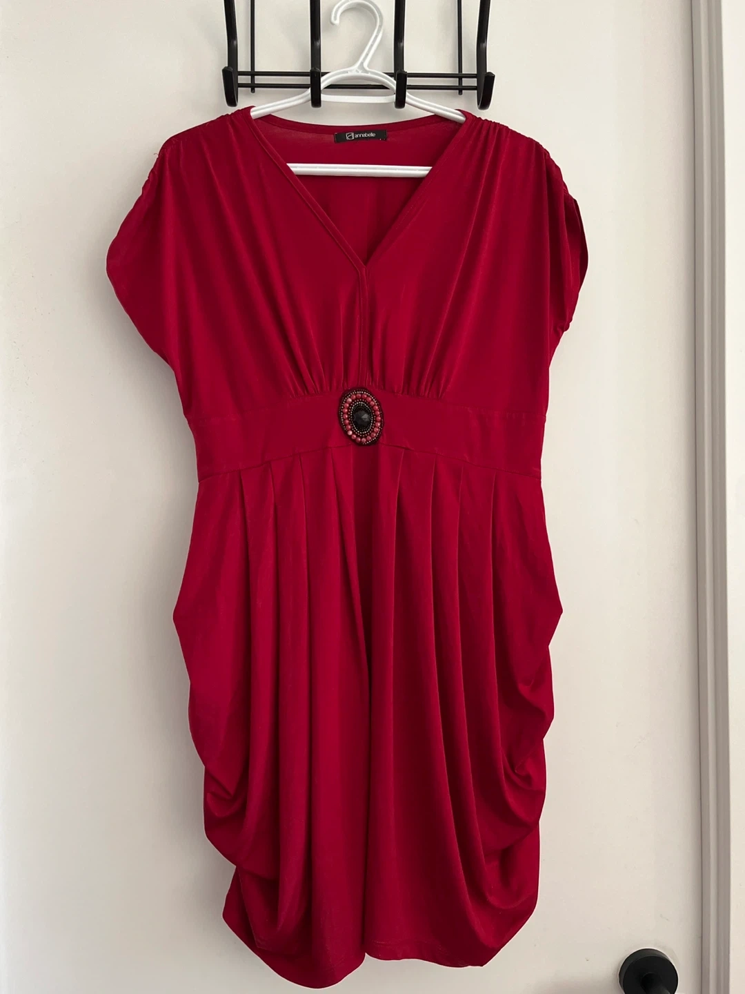 Selling a lovely red dress from Annabelle! It's in great condition and features a unique design with a decorative accent at the waist. Perfect for adding a pop of colour to your wardrobe