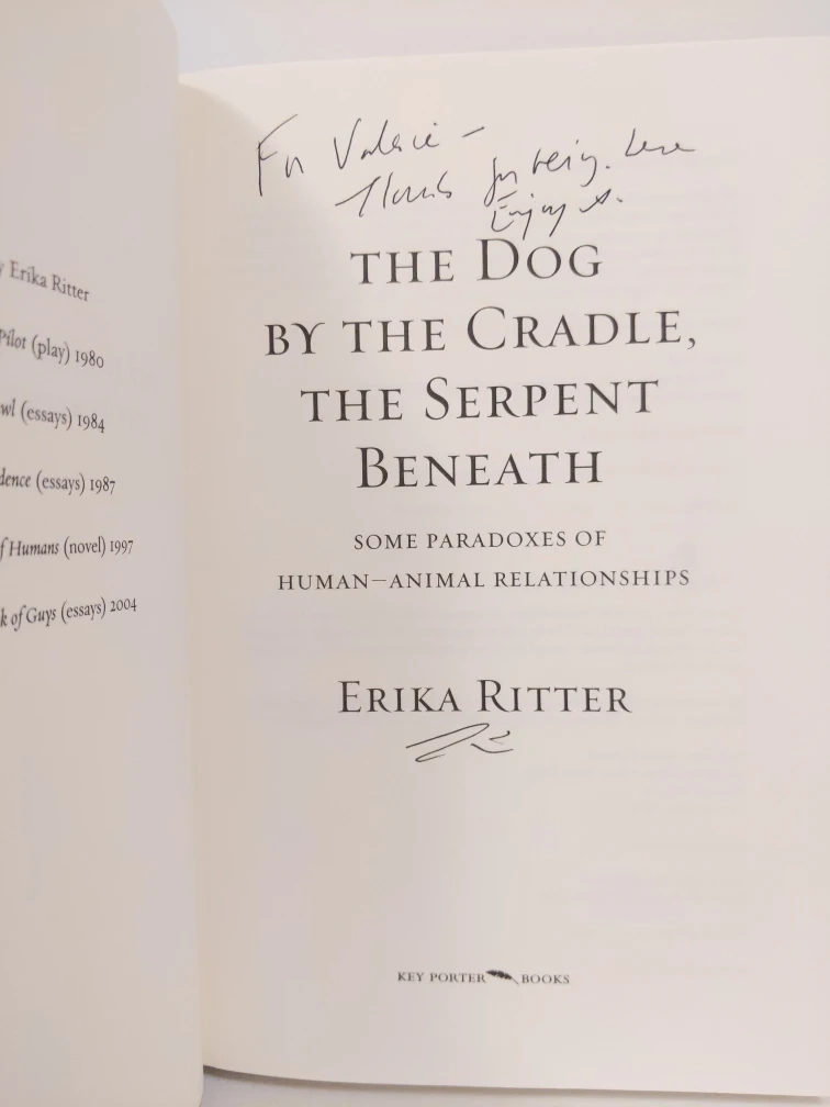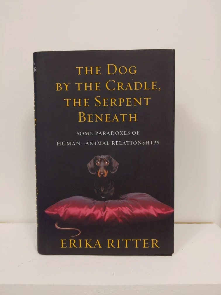 Selling a hardcover copy of "The Dog By The Cradle, The Serpent Beneath: Some Paradoxes of Human-Animal Relationships" by Erika Ritter. It's a thought-provoking book that explores the complexities of our relationships with animals. A great read for anyone interested in animal welfare and human-animal interactions
