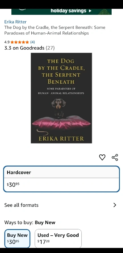 Selling a hardcover copy of "The Dog By The Cradle, The Serpent Beneath: Some Paradoxes of Human-Animal Relationships" by Erika Ritter. It's a thought-provoking book that explores the complexities of our relationships with animals. A great read for anyone interested in animal welfare and human-animal interactions