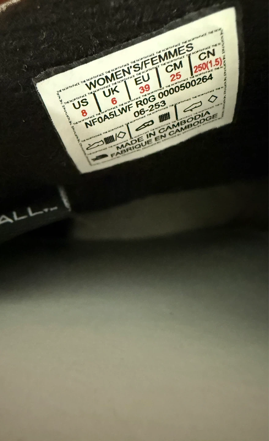 These black and white The North Face women's ThermoBall snow boots are a size 8 US women's. They feature a zip-up design and are insulated for warmth. Perfect for staying cozy in cold weather!