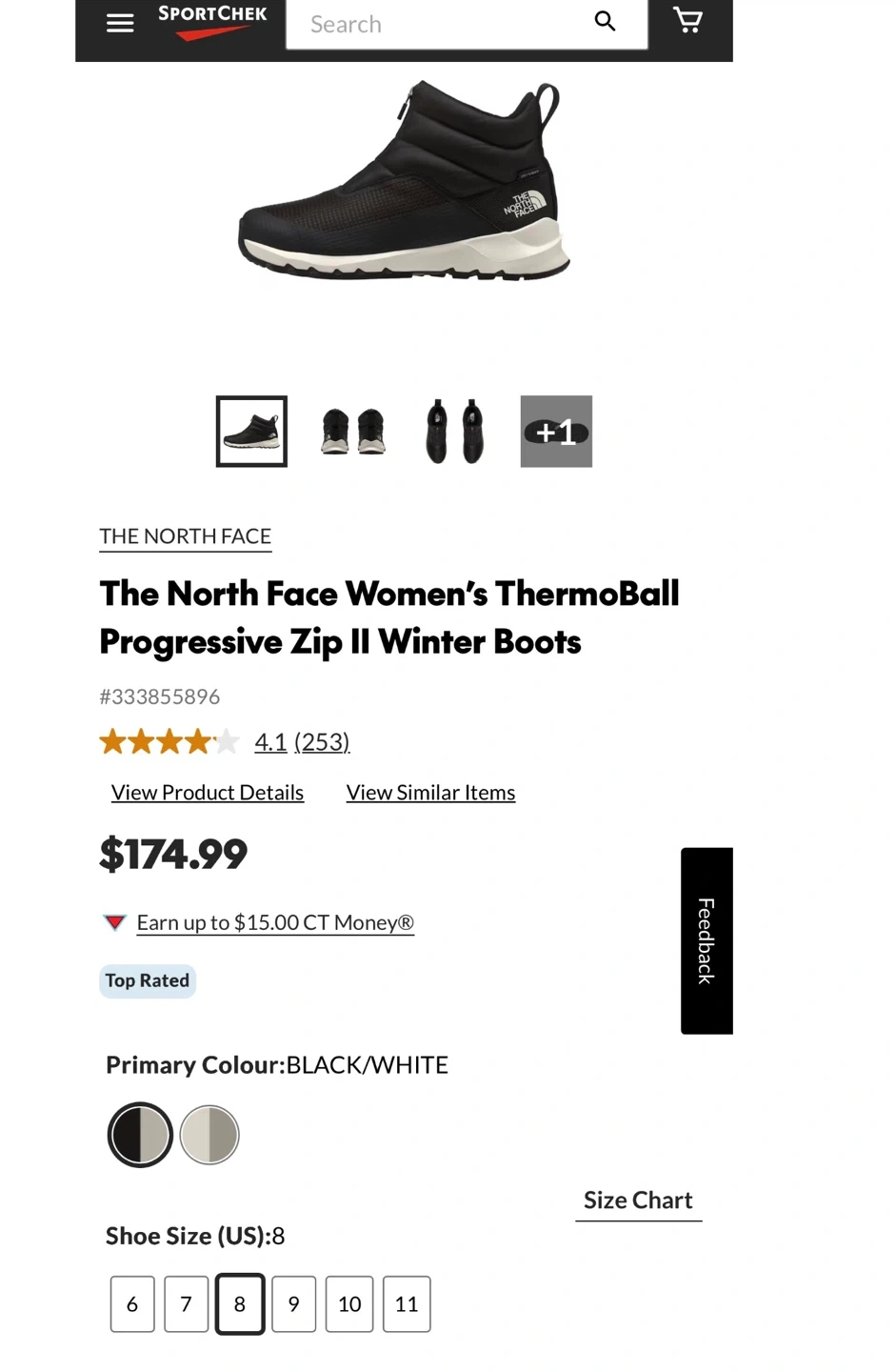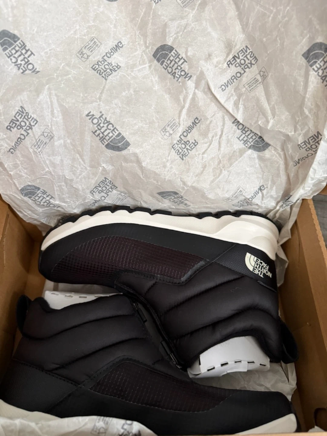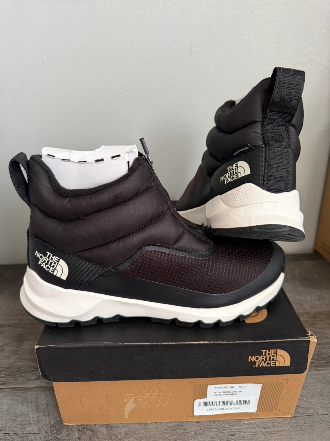 These black and white The North Face women's ThermoBall snow boots are a size 8 US women's. They feature a zip-up design and are insulated for warmth. Perfect for staying cozy in cold weather!