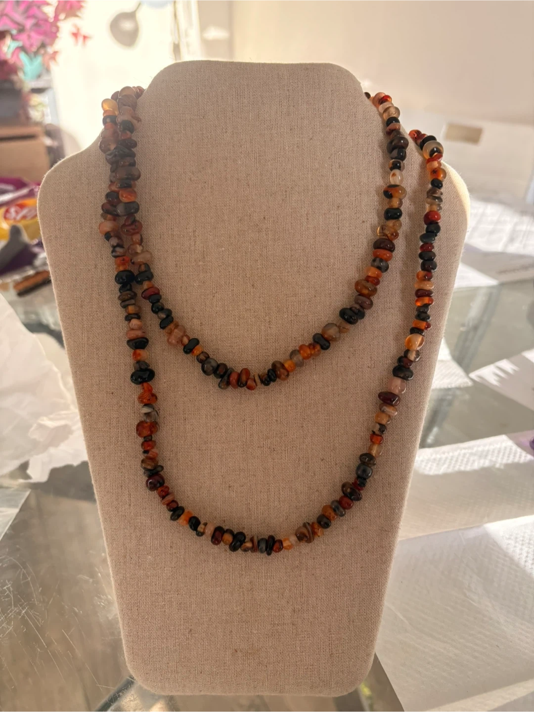 This is a lovely beaded necklace with a mix of orange, brown, and black beads! It comes with its original box and is in great condition