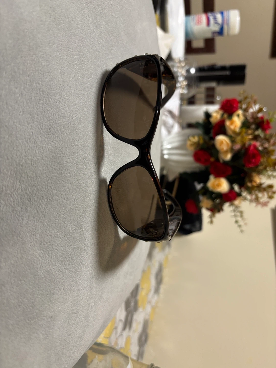 Selling a pair of sunglasses with rhinestone embellishments. They have a brown tortoiseshell pattern and are in good condition. Stylish and ready to wear!